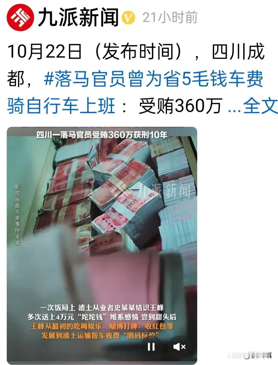 曝四川成都一落马官员为省五角车费骑自行车上下班。受贿也不多,只有360万。2024年7月,王峰因犯受贿罪、行贿罪,被依法判处有期徒刑10年4个月,并处罚金人民币60万元。相比那些贪污上亿的,这个王峰只是小鱼而已,他人生真不划算。如果不受贿,一个三级调研员,活到八十岁,离现在还有28年,平均一年至少20万,收入总共560万,再加上住房公积金等,至少700万左右,你说他脑子是不是进水了?这笔账难道他不会算吗? 也许骑自行车是自己的一种习惯,或许是在向外人掩盖自己吧,典型的两面人。这种人迟早会东窗事发的。