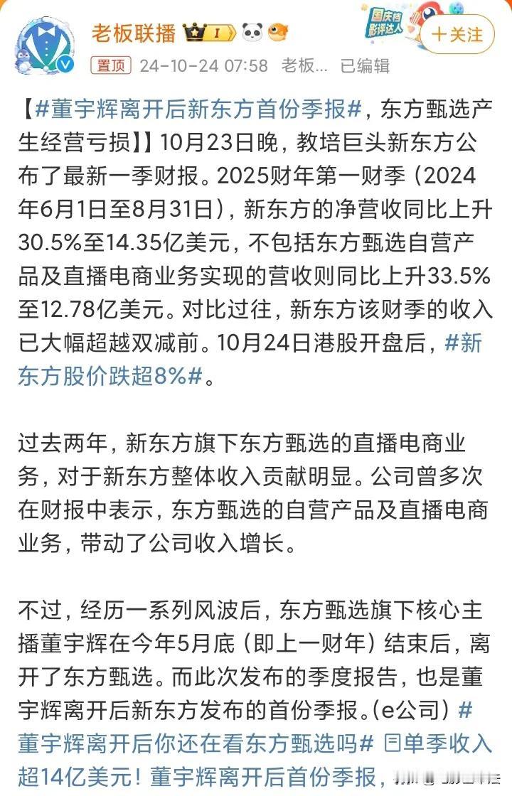 董宇辉离开新东方后,新东方季度净营收同比上升30.5%,由11亿美元上涨到14.35亿美元,这才是俞敏洪的底气。 很多人过分夸大董宇辉对俞敏洪公司的贡献,殊不知东方甄选直播业务在俞敏洪所有业务中占比很低,也就是说,董宇辉没离开前贡献再大,对俞敏洪的重要性,远远没都市银发族和县城贵妇想象的那么重要。 可怜都市银发族和县城贵妇这两个明明那么普通,偏偏那么自信的群体,自以为茶王的业绩是背刺的底气,自以为能拿捏的住俞敏洪,殊不知在俞敏洪眼里,根本不需要把这两个群体当回事。