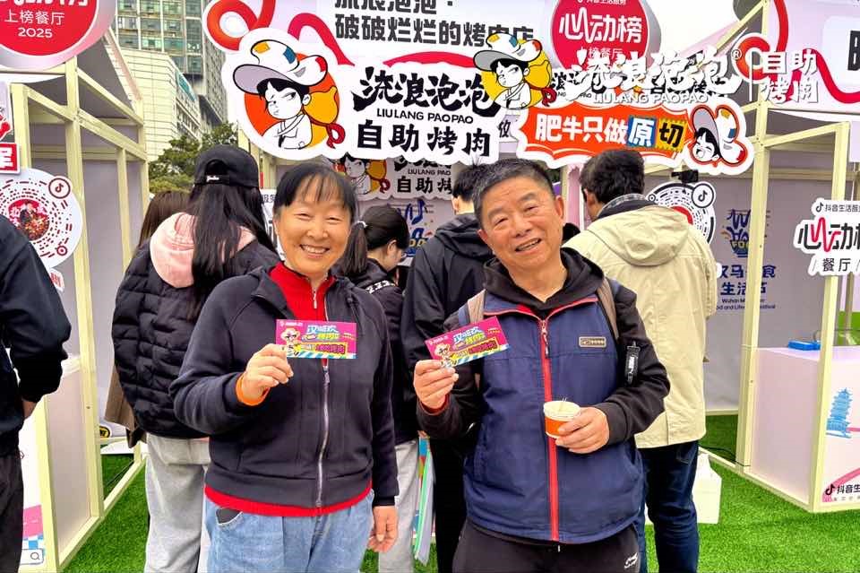 与此同时,品牌在互动体验维度同步发力:经典IP形象人偶与“烤肉蒜鸟”憨态可掬,参赛者者和市民争相合影打卡,现场欢声笑语不断,氛围感拉满;互动抽奖环节,汉马专属主题餐券不仅为现场增添了惊喜感,更成功搭建起从“市集体验”到“门店消费”的转化桥梁,实现了品牌体验与消费转化的双向赋能。抽到餐券的市民纷纷表示:“跑完马拉松正好需要补充能量,拿到餐券一定要去门店好好体验一次!”现场也有不少熟悉流浪泡泡的老顾客专程前来打卡,在社交平台上晒图分享。