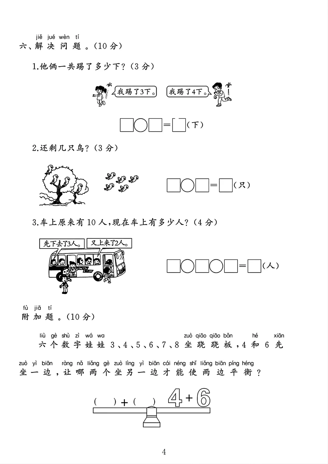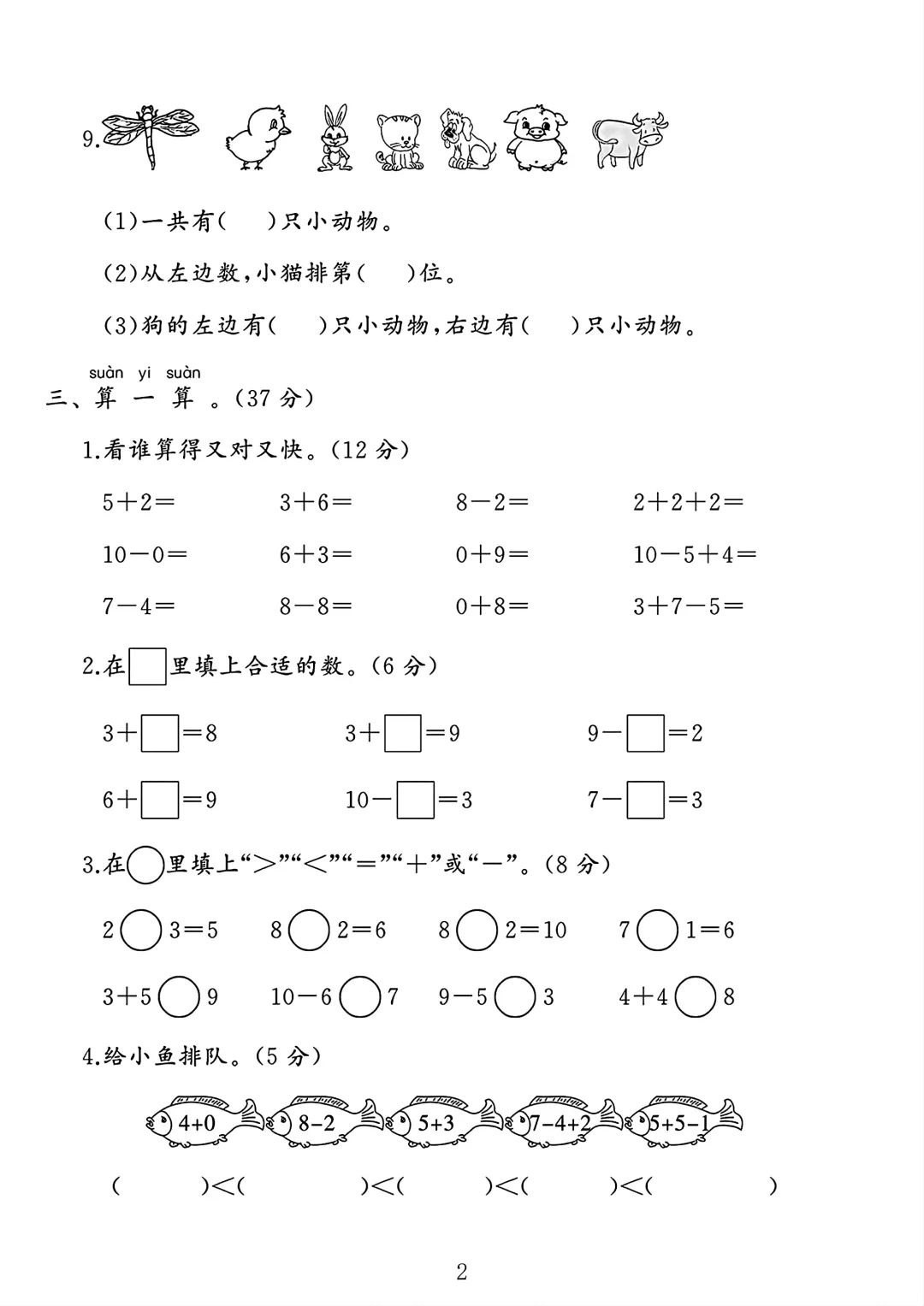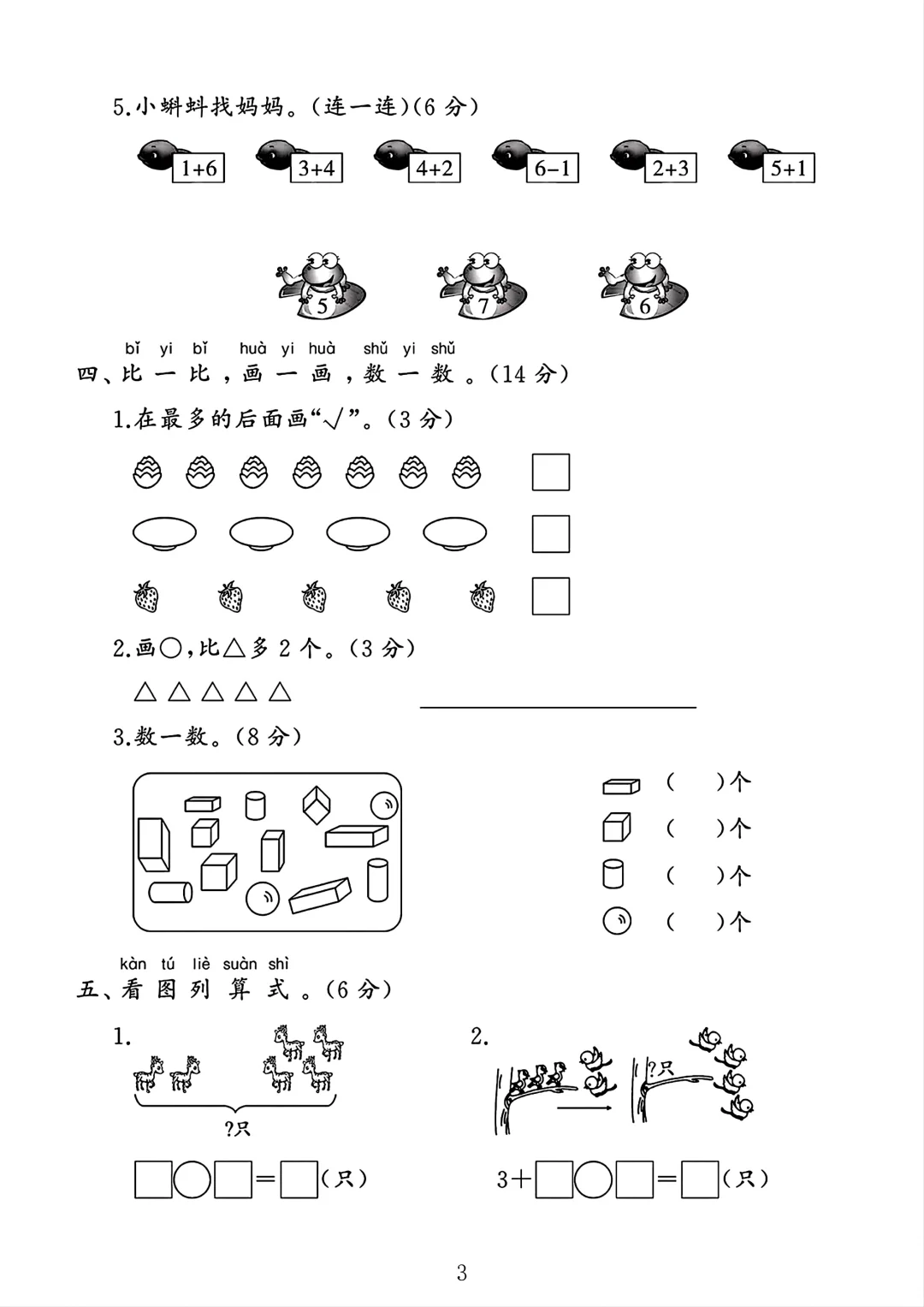 人教版 一年级上册数学 期中考试 期中试卷 电子版可打印 试卷