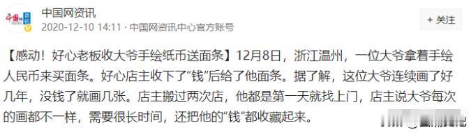 2013年,浙江温州,1名60多岁的老人,拿50元钱跟28岁店主买面,店主给他称2斤面,却不给他找零钱,店主妻子见状,让店主不要卖面给老人,但店主却不听。 (参考信源:光明网) 当人们收到假币时第一反应肯定是报警!可温州这位老板偏偏就用它展现了一出人间真情。 故事的主角是一位年过花甲的老人——郑祖龙。他第一次出现在李国色的面馆时蓬头垢面,手里攥着一张手绘的“50元”。那画工怎么说呢,跟小学生涂鸦有一拼。 李国色一眼就瞧出不对劲,可看着老人期盼的眼神他还是接过了那张“钱”,称了两斤面条。 这事儿要是搁别人身上估计早就报警了。可李国色不一样,他打小苦日子过惯了知道生活不易,能帮一把是一把。更何况老人那眼神,分明是把这手绘“纸币”当成了宝贝。 李国色的妻子吴春明一开始可不乐意了,觉得自家男人这是在“赔本赚吆喝”。可李国色有自己的想法,他不想让老人觉得是在接受施舍,而是希望他能够体面地“买”到食物。 于是一场长达八年的“默契”就此展开。老人时不时会来光顾面馆,每次都带着他精心绘制的“巨款”——100元、1000元面额越来越大,画工也日益精进。 李国色每次都郑重其事地收下,然后送上一大袋面条外加火腿肠、榨菜什么的,绝不让老人空手而归。 街坊邻居们议论纷纷,有人说李国色傻有人怀疑老人是装的。可李国色从来不解释,只是淡淡一笑:“几斤面而已能帮他度过一天就好。” 后来人们才知道郑祖龙并非有意欺骗,他从小因意外导致智力受损无法像正常人一样工作生活。那手绘的“纸币”是他用尽全力想要融入社会的证明。 李国色他并非生来善良。五岁丧母父亲忙于生计,他从小尝尽了人间冷暖,全靠街坊四邻的接济才得以长大。北漂打工时又因水土不服病倒,是工友们凑钱给他治病送他回家。 这些经历像一颗颗种子在他心里生根发芽,最终长成参天大树为他遮风挡雨,也为他撑起一片荫庇他人的天空。 2022年1月一场突如其来的车祸带走了郑祖龙的生命。消息传来李国色悲痛万分,他赶到郑家吊唁,看着老人慈祥的遗像九年来的点点滴滴涌上心头,忍不住潸然泪下。 他将那些承载着温暖和善意的“手绘纸币”付之一炬,希望老人在另一个世界也能吃上一碗热腾腾的面条。 李国色的故事感动了无数人。有人说他是这个时代的“活雷锋”,也有人说他用一碗面的温度温暖了整个冬天。 李国色的故事就像冬日里的一缕阳光照亮了人性的光辉,也让我们相信即使是在这个充满浮躁和冷漠的时代,爱和善良依然是人间最美的风景。