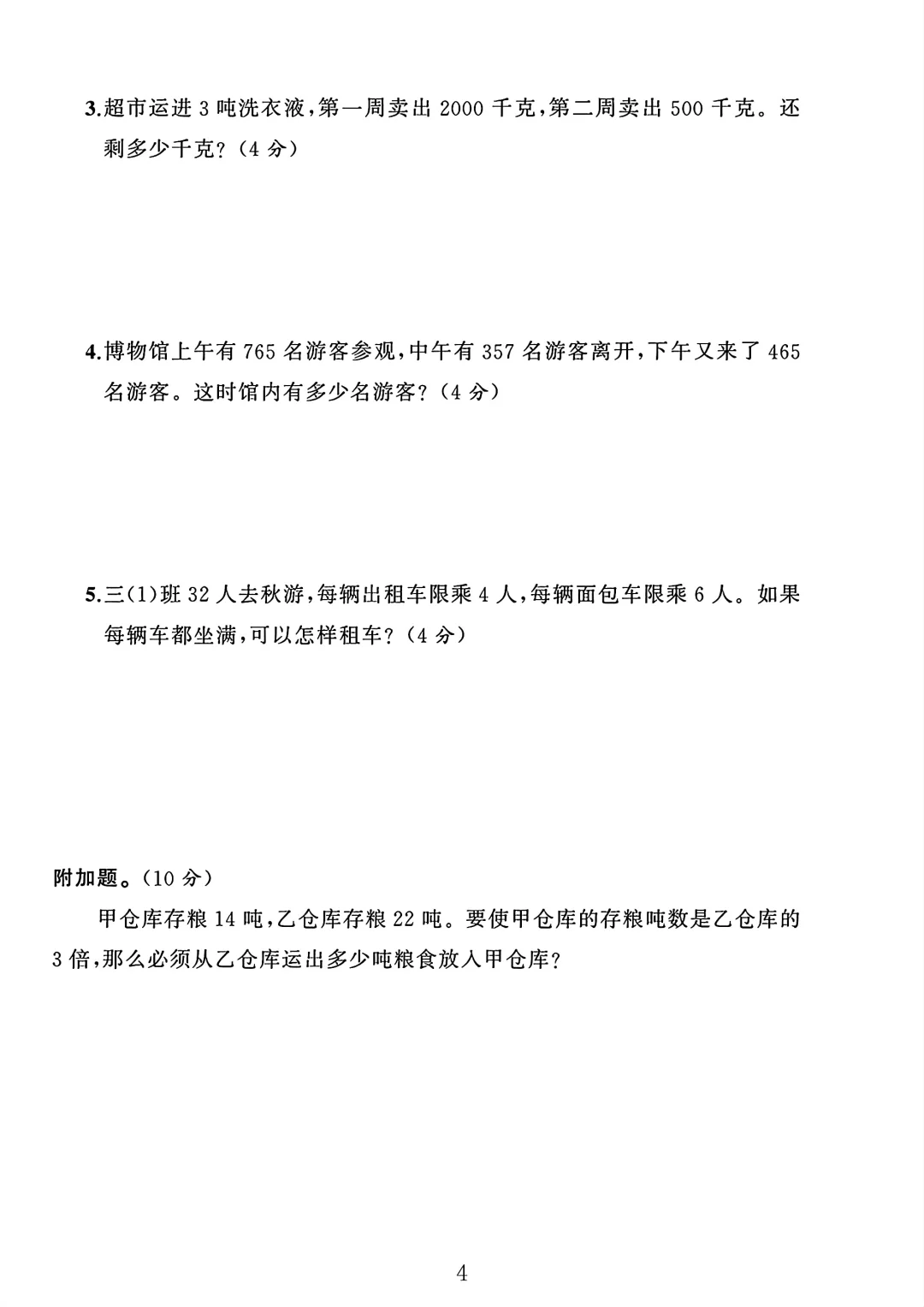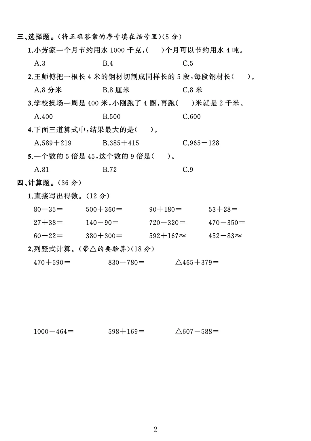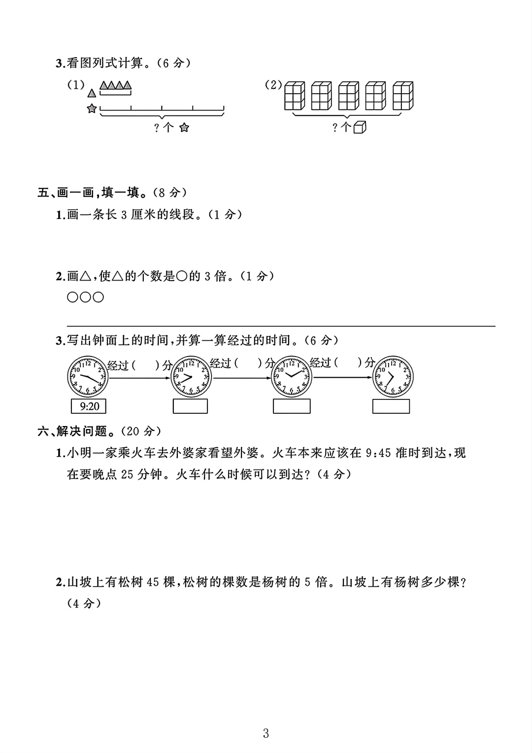 人教版 三年级上册数学 期中考试 期中试卷 电子版可打印 试卷