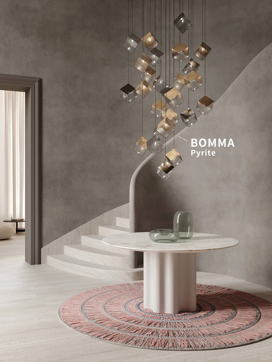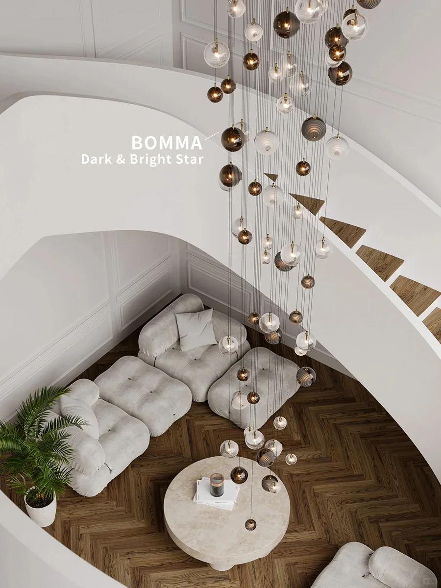 🔘楼梯井的多头吊灯提前设计好造型确认吊线高度。