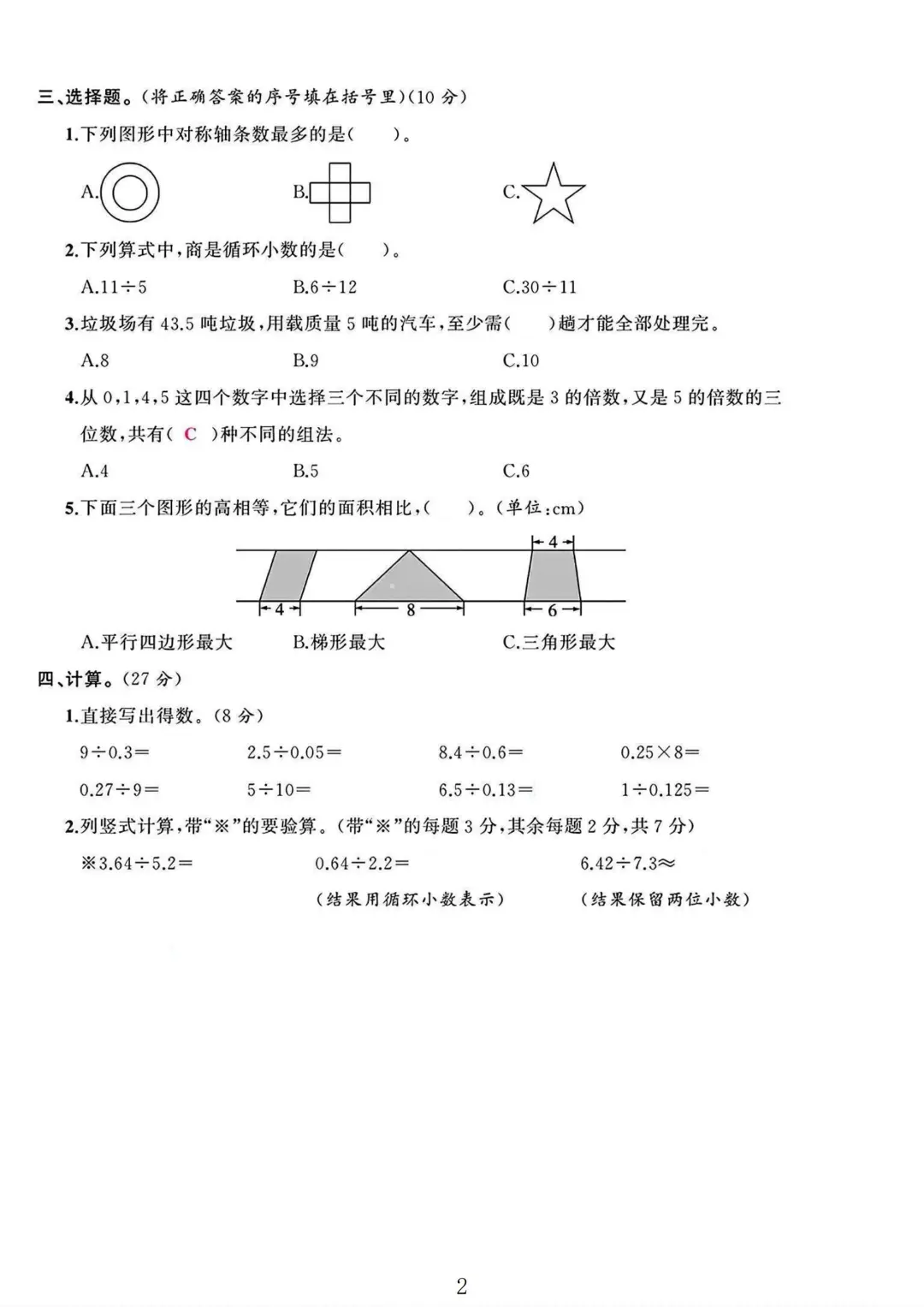 北师大版数学 五年级上册数学 期中考试 期中试卷 电子版可打印
