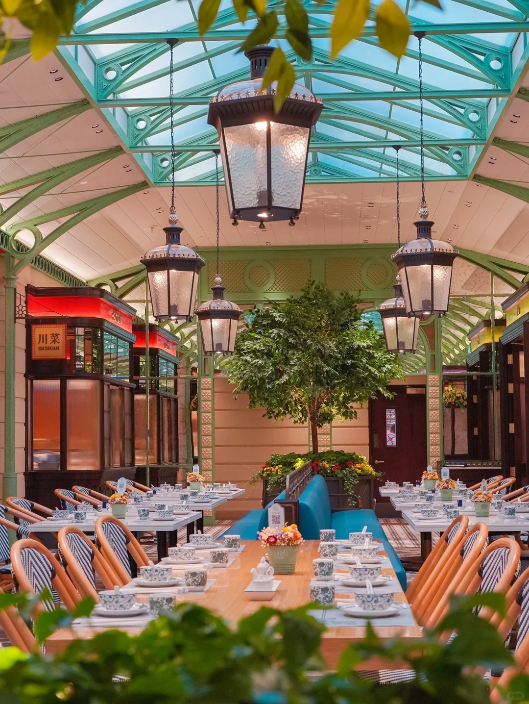 餐厅室内玻璃穹顶和黑色英伦风的吊灯都复原了伦敦西区科文特花园,森系餐厅氛围感好爱,