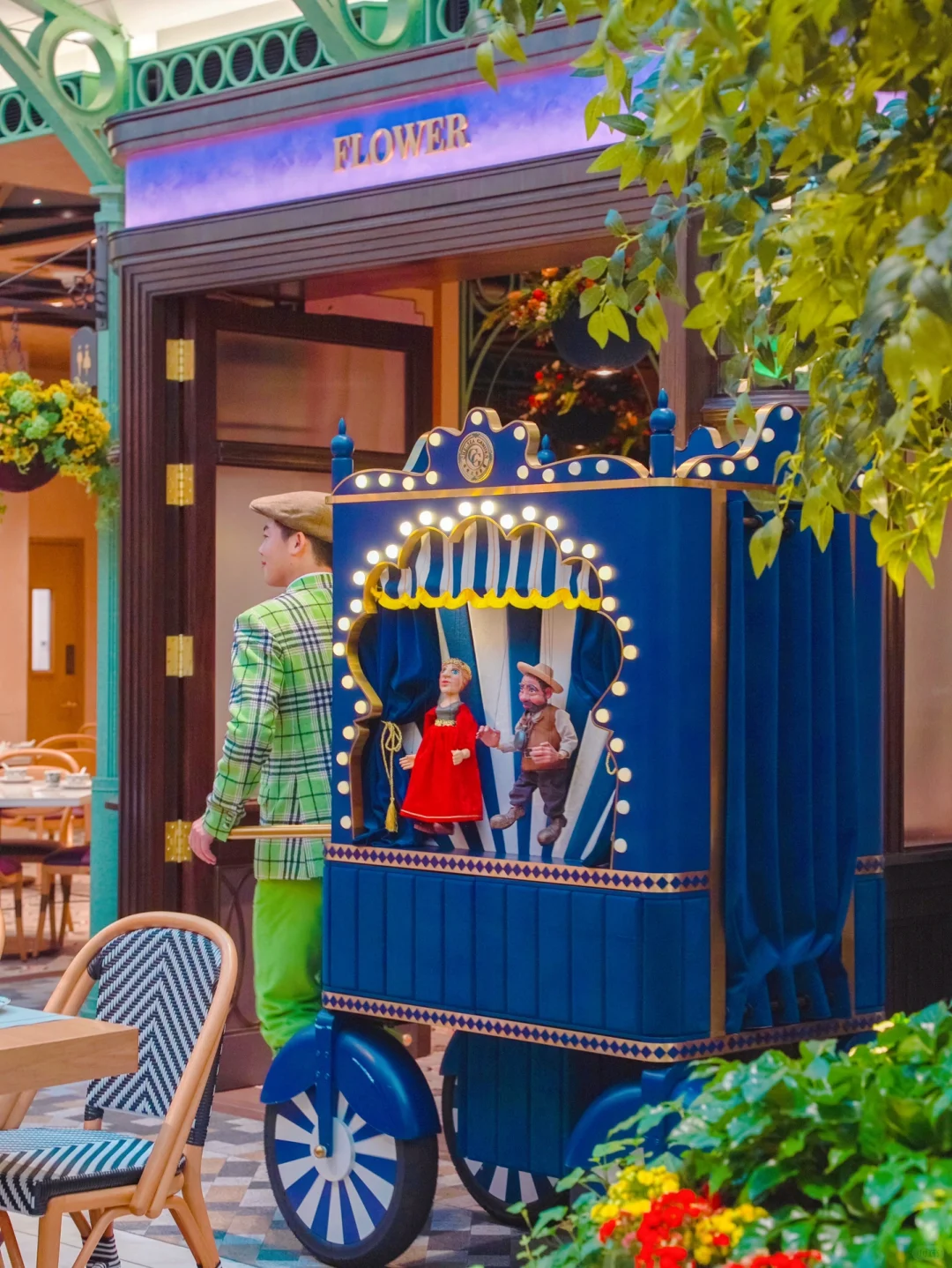 👉🏻英伦风穿搭的男生推着像马戏团里的小推车收餐盘,小推车还有两种不同的颜色,他们还会跟客人互动打招呼哦。