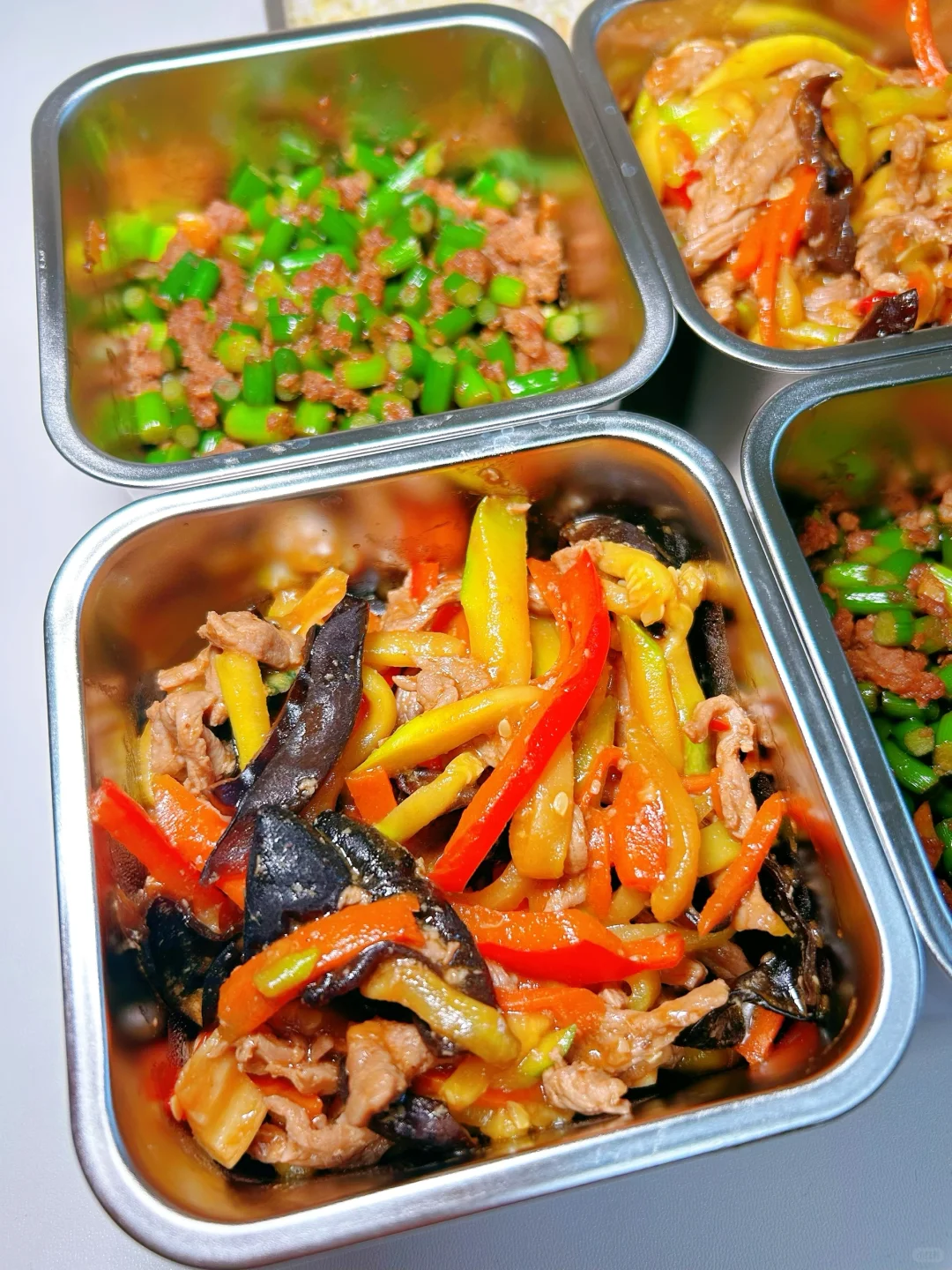 晚上或早上备菜, 中午翻炒、颠勺、起锅咯。 今日晚餐: 鱼香牛肉丝(饭渣不吃青椒,换成了西葫芦) 蒜苔肉末、菠菜蛋卷、燕麦小米饭 教程左滑图片。