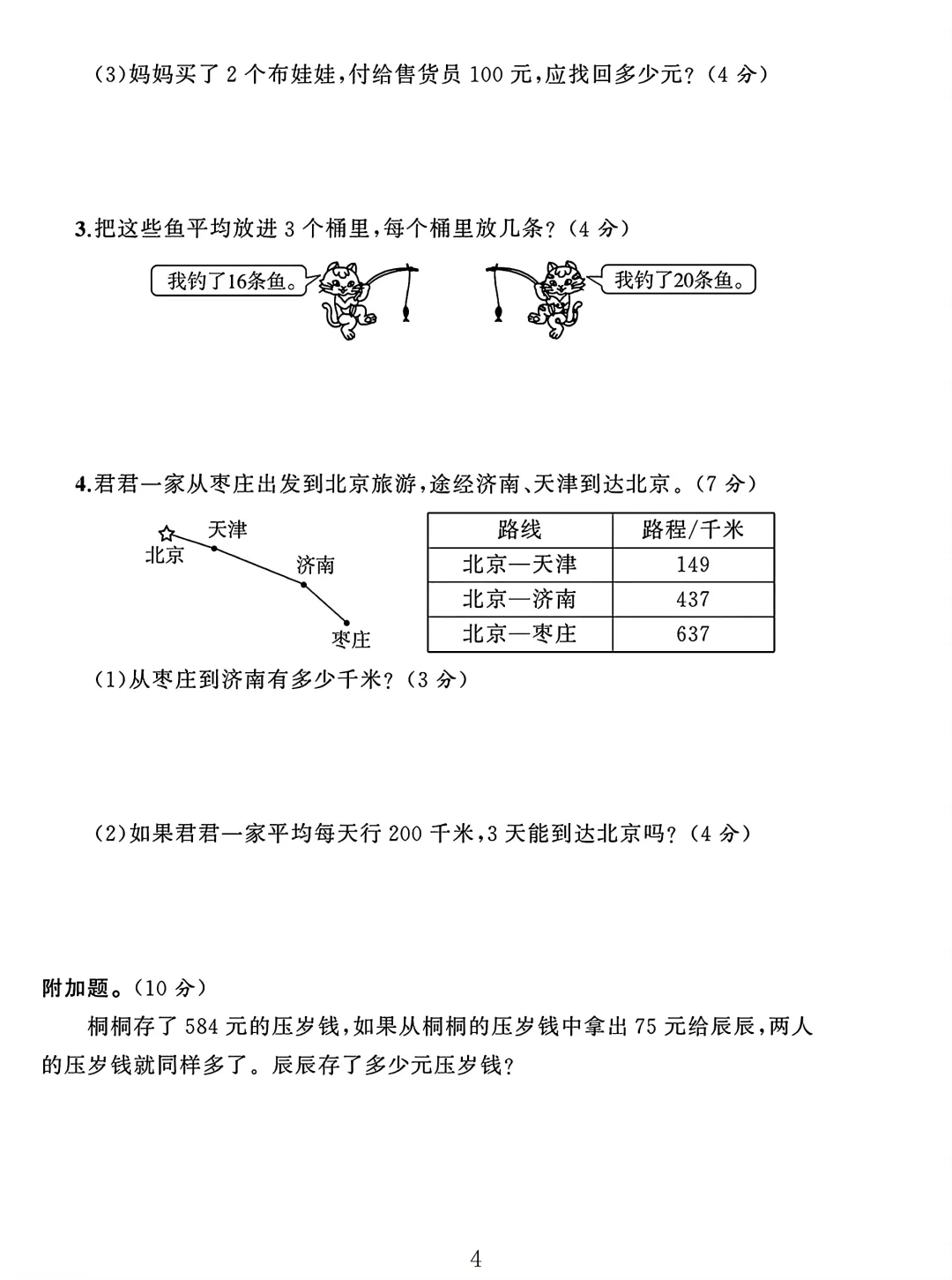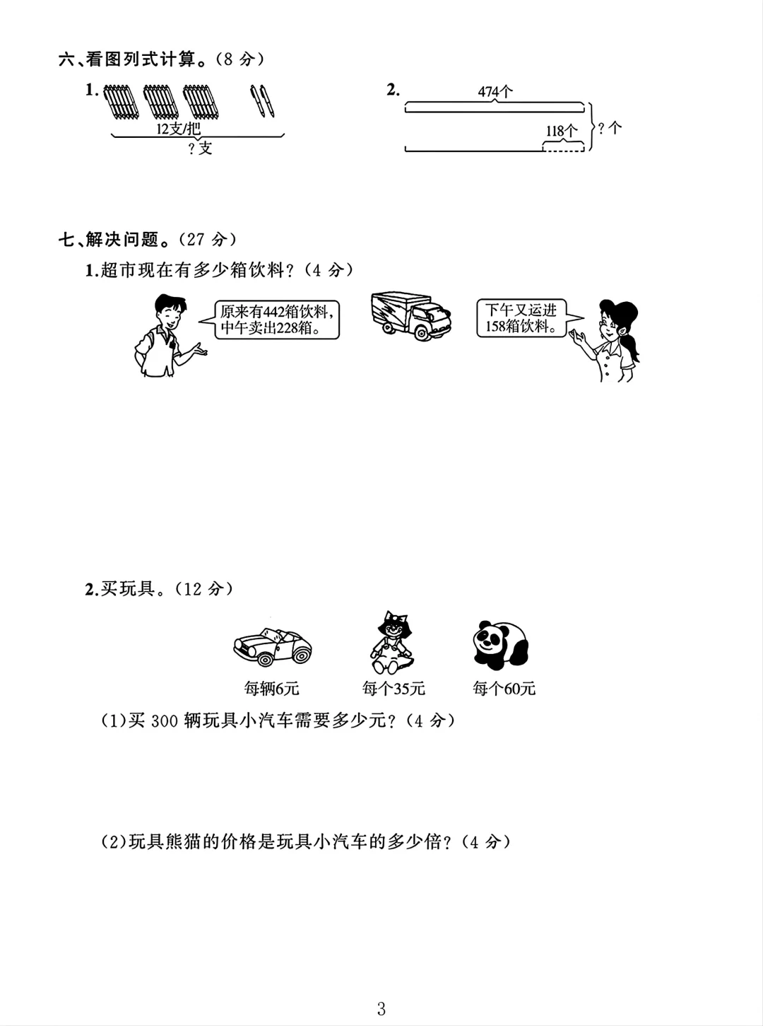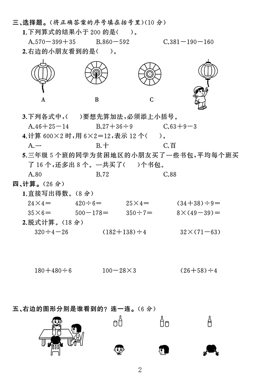 北师大版数学 三年级上册数学 期中考试 期中试卷 电子版可打印 试卷
