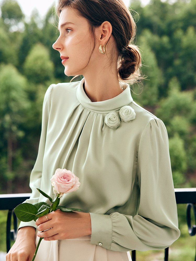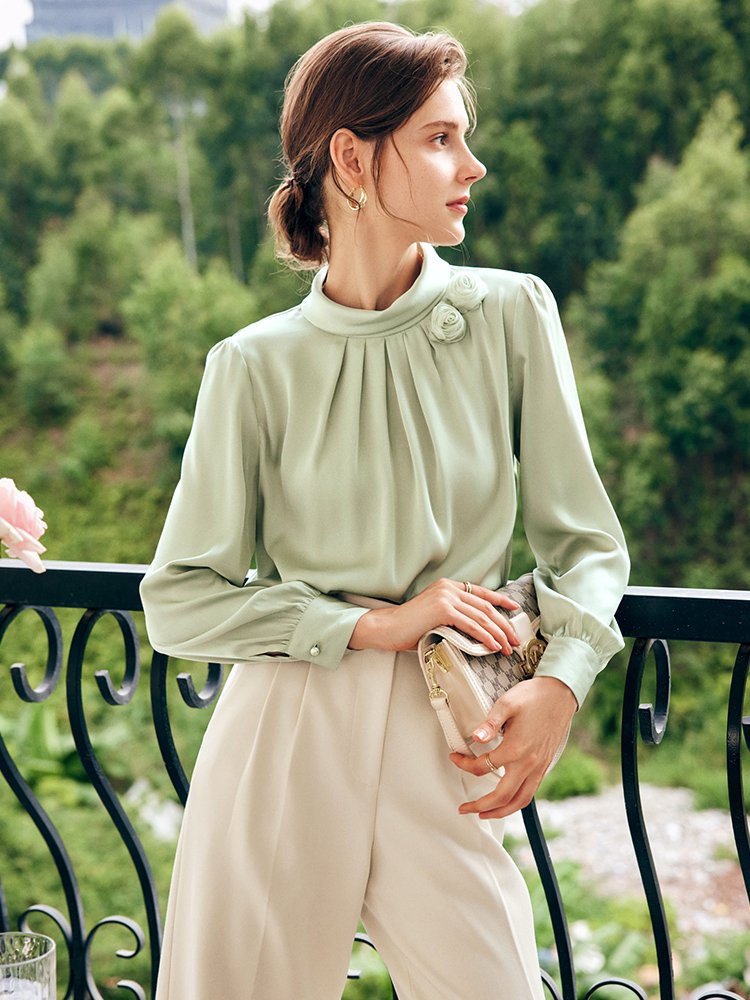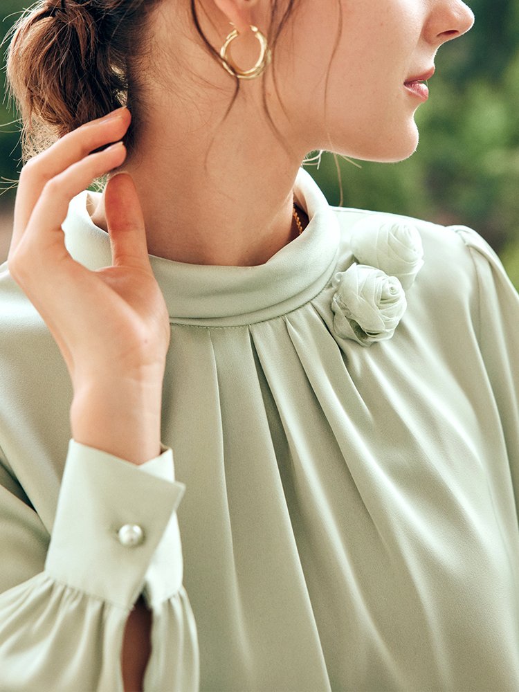甄选时装料,面料丝质顺滑,高密透气;亲肤自然,垂坠感好,舒适有型;精至圆形小立领设计,展现优美颈线;后领精至水滴扣,自如套头穿着;领口下方立体收褶,丰富衣身层次感;胸口单边手编花装饰,灵动立体有设计点;增添气质优雅感,透露精至与不俗;袖顶捏+袖口珍珠扣,举手投足落落大方