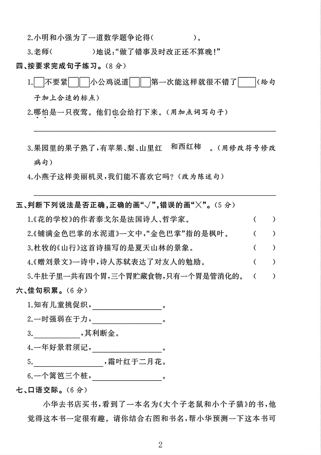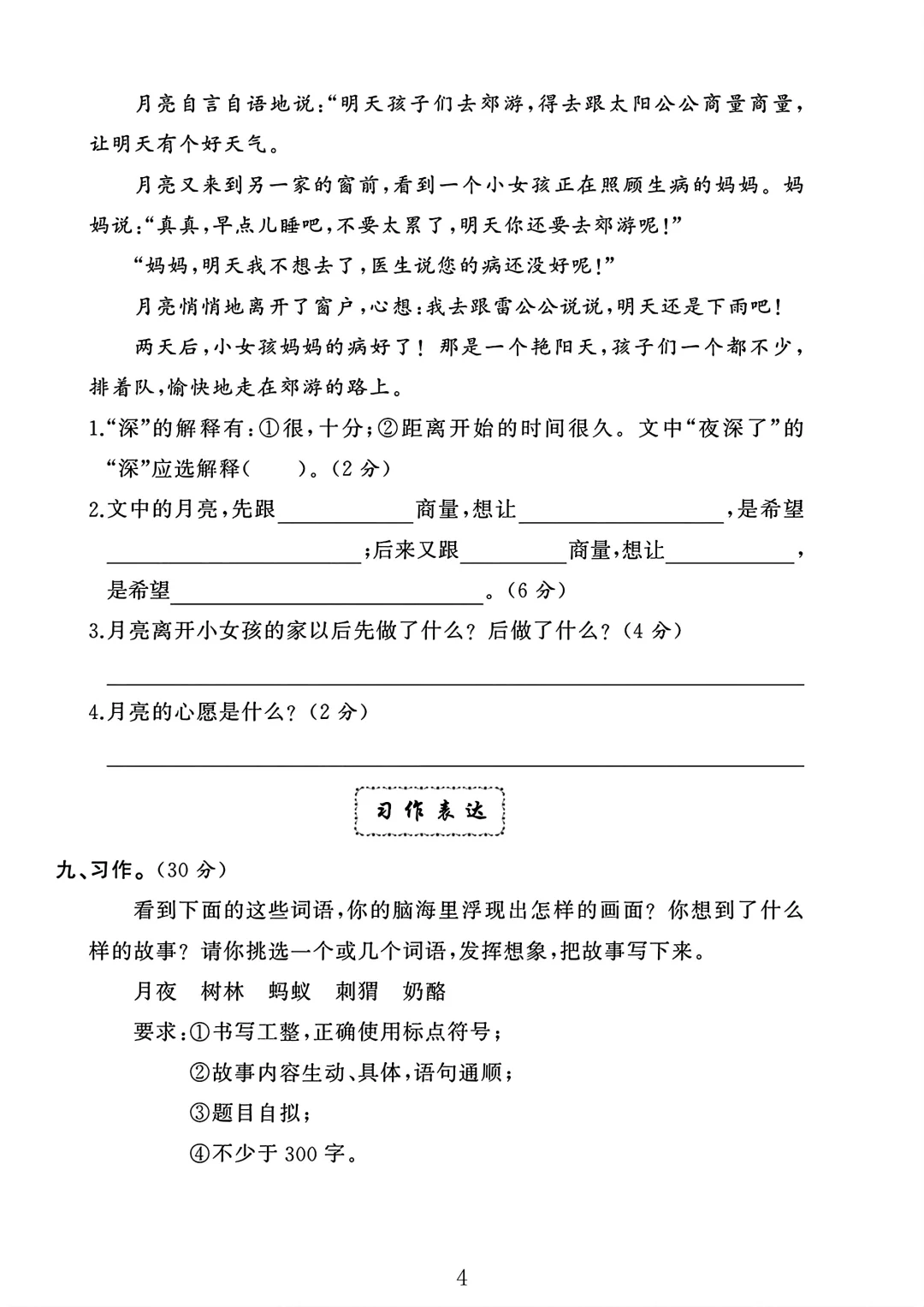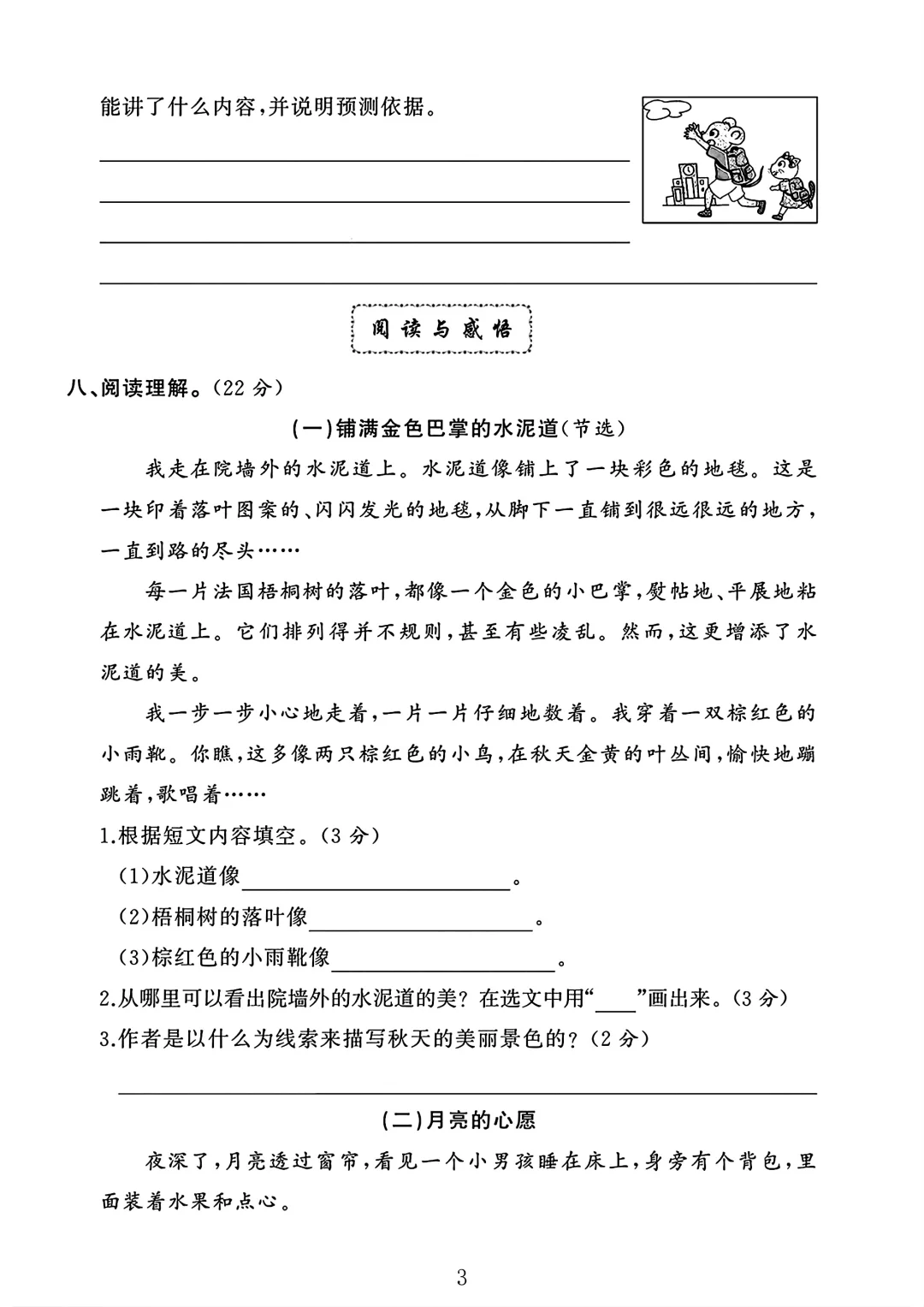 人教版 三年级上册语文 期中考试 期中试卷 电子版可打印 试卷
