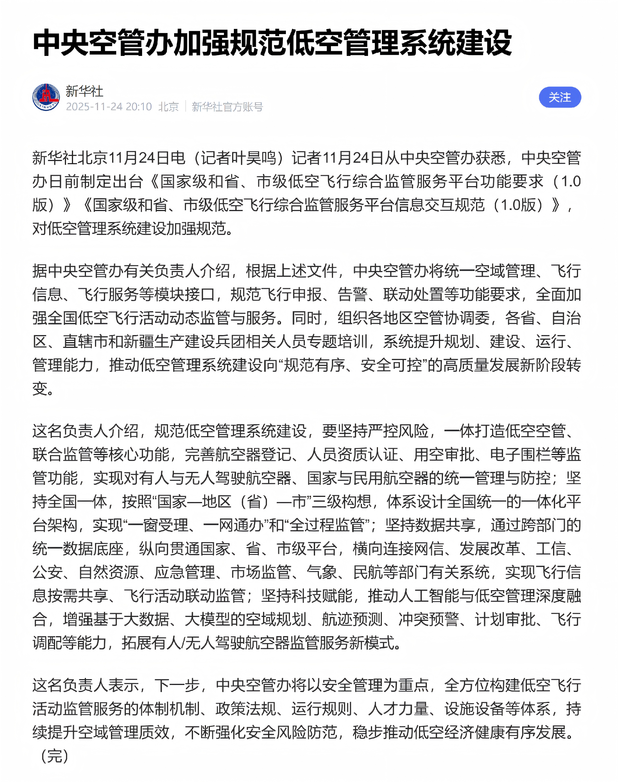 据新华社消息,中央空管办日前制定出台《国家级和省、市级低空飞行综合监管服务平台功能要求(1.0版)》《国家级和省、市级低空飞行综合监管服务平台信息交互规范(1.0版)》两份重磅文件。这标志着我国低空管理从分散探索走向统一规范的新阶段,为低空经济高质量发展奠定了制度基础。