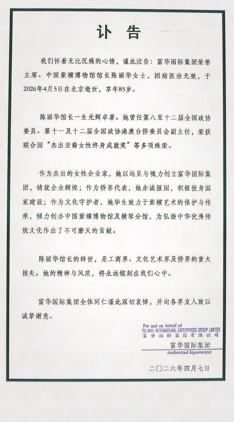 2026年4月7日,富华国际集团、北京侨商会联合发布讣告,集团荣誉主席、中国紫檀博物馆馆长陈丽华女士,因病医治无效,于4月5日20时50分在北京逝世,享年85岁 。