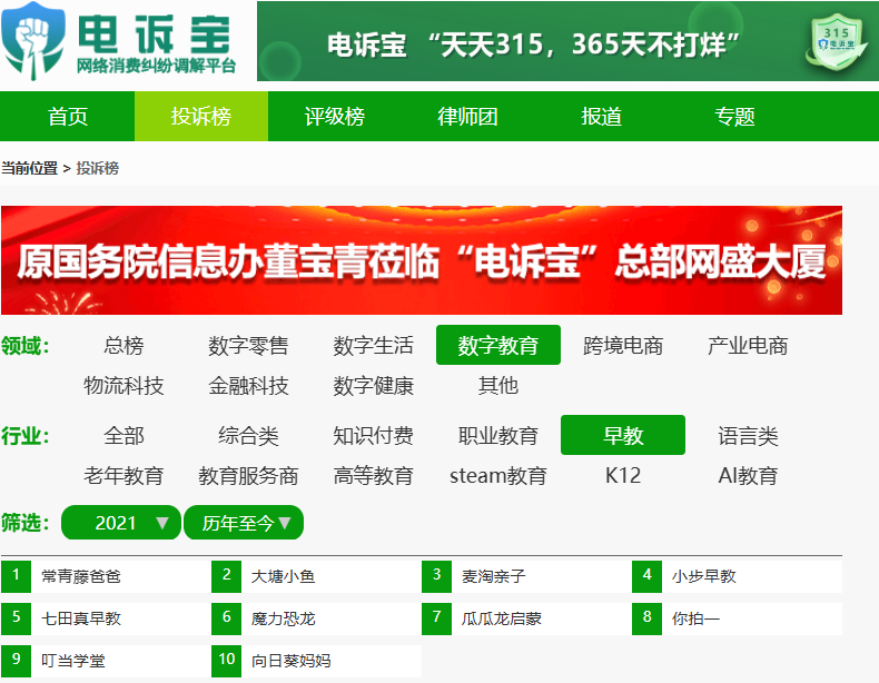 根据“电诉宝”2021年至今受理的数字教育中的早教领域用户有效投诉显示(依据投诉量排行),“常青藤爸爸”排名第1位。除此之外,其他被投诉的类似平台还有:大塘小鱼、麦淘亲子、小步早教、七田真早教、魔力恐龙、瓜瓜龙启蒙、你拍一、叮当学堂、向日葵妈妈。
