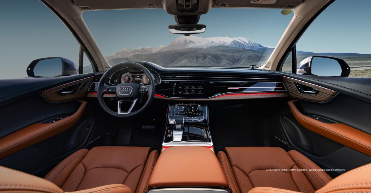 在车内的驾乘空间里,2025款奥迪Q7的内饰设计风格继承了奥迪家族的大气且精致,并不失实用,作为一款豪华品牌的旗舰级SUV,其配备了更奢华的用料,即便是入门车型,从门把手到饰板等都有大范围皮革覆盖,除此之外还有多款木纹饰条可供选配,并有环绕全车的30*30色反射式LED灯带,法国品牌Robertet专属研发的高档车载香氛,全方位提升车内的豪华氛围感。