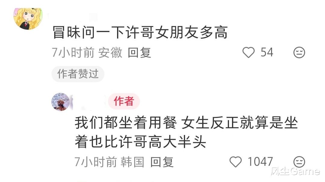 最搞笑的是网友的回复,有人问:许哥女友有多高?网友回应:女生就算是坐着,也比许哥高大半个头,那保底应该在165以上了吧,许哥的身高一直是个谜,网传说是只有156,高十厘米的话,坐着应该差不多就是半个头了,恋爱都谈上了,不知道新赛季,许哥还能不能保持住状态。