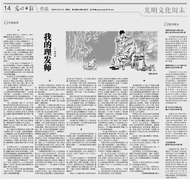 近日,军旅作家张明刚的散文《我的理发师》刊发于《光明日报》,以一把剃刀、几缕青丝为引,串联起半生岁月流转,于寻常烟火中镌刻匠心温度,在时代变迁里坚守初心本色,既是个人成长的温情回望,更是对工匠精神与人间真情的深情礼赞,读来令人动容、引人深思。