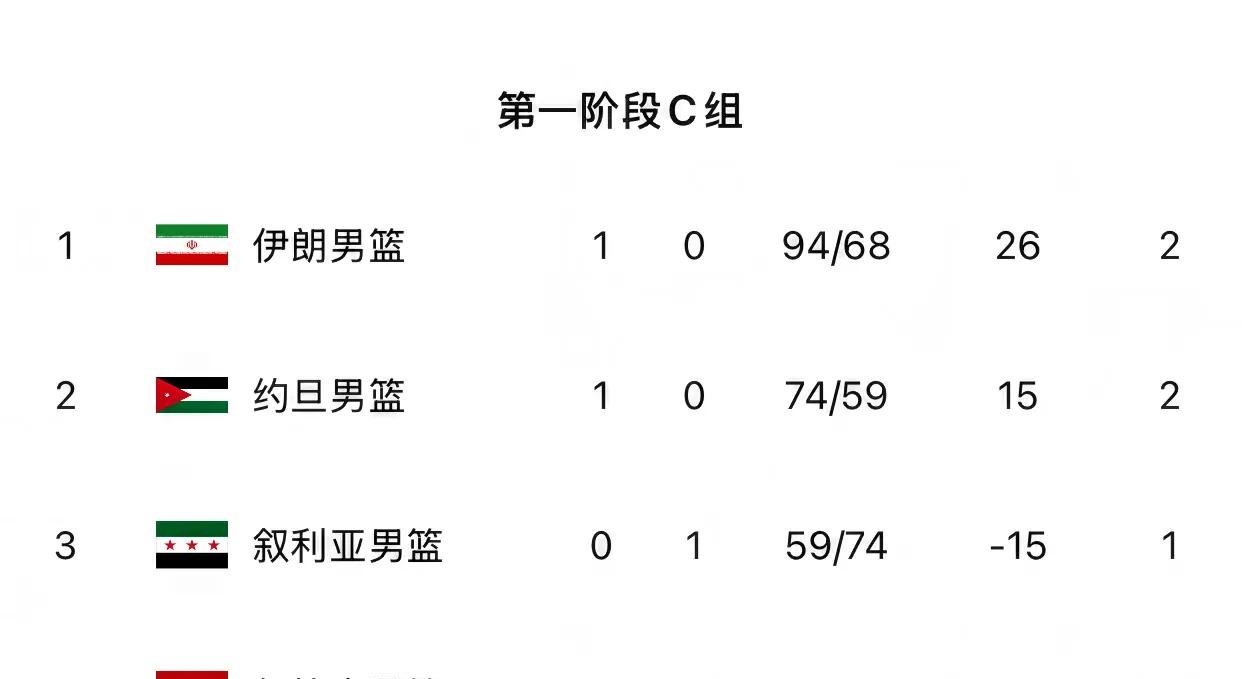 现在C组形势是这样的:伊朗队1胜,净胜分26分,排第一;约旦队1胜,净胜分15分,排第二;叙利亚队1负,净胜分-15分,排第三;伊拉克队1负,净胜分-26分,排第四。