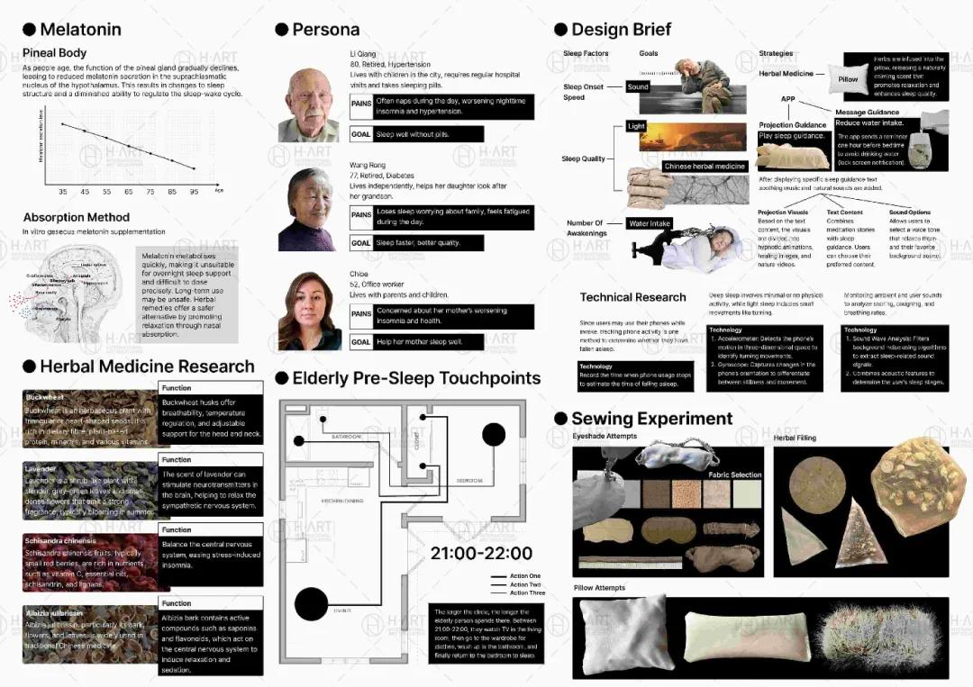 例如汉艺S同学关于老人失眠的项目,他通过调研发现很多老人都会遇到“夜里入睡困难、白天打瞌睡”等情况,但老人使用药物治疗或助眠产品在用量上无法准确掌握。