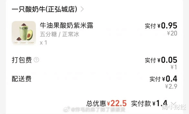 在社交媒体上,消费者晒出的订单截图成了饿了么“真便宜”的最佳注脚。有人花0.4元买到了包含奶茶、小料和打包费的套餐,有人1.4元拿下牛油果酸奶紫米露,这样的低价在外卖市场实属罕见。
