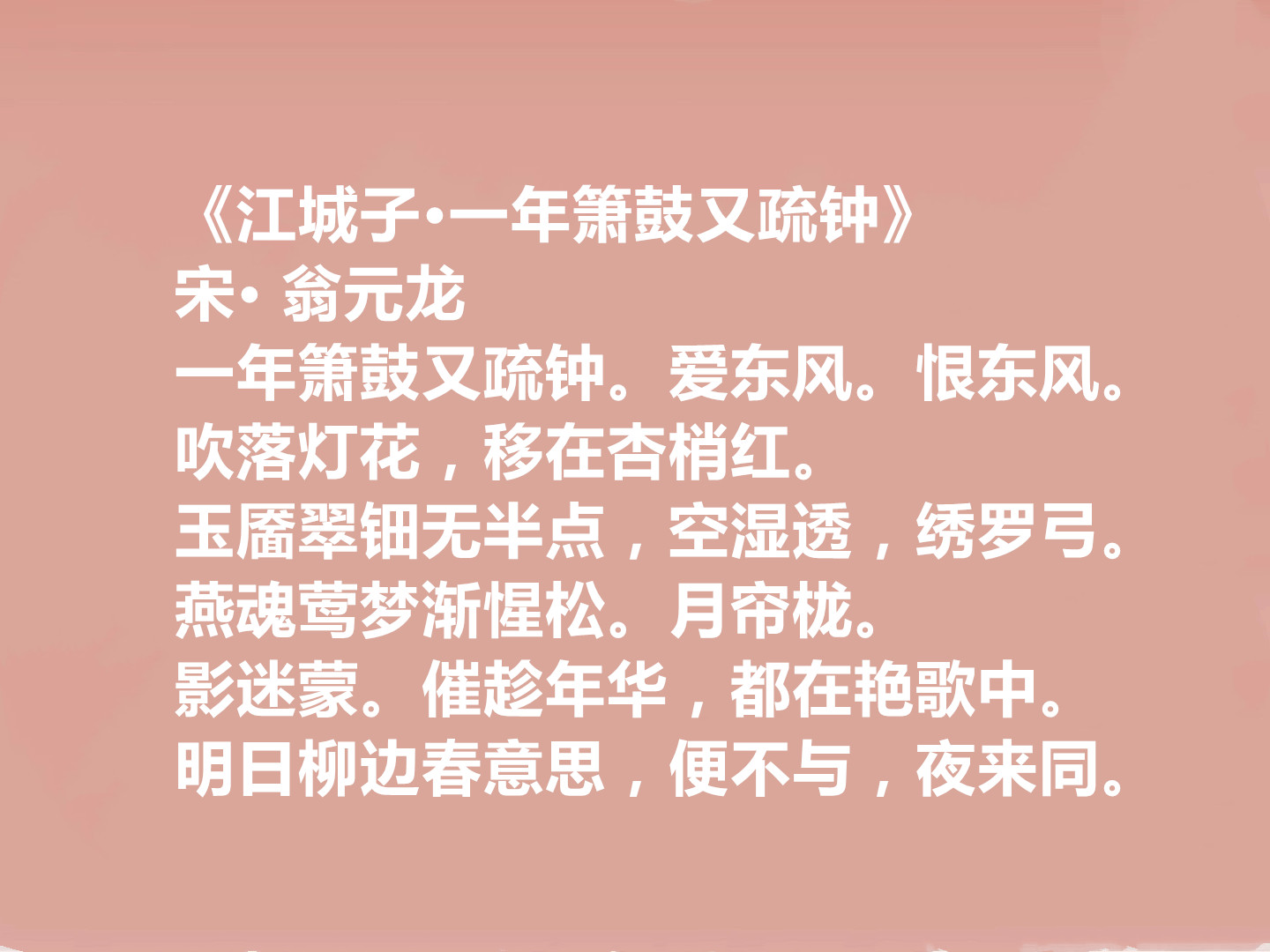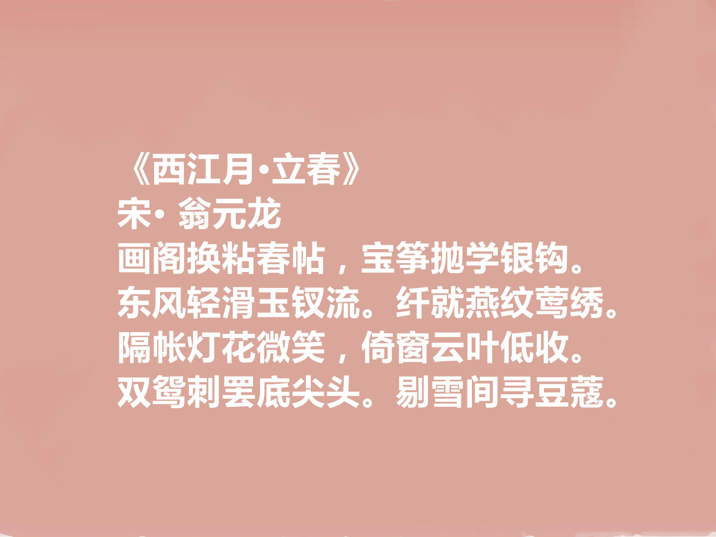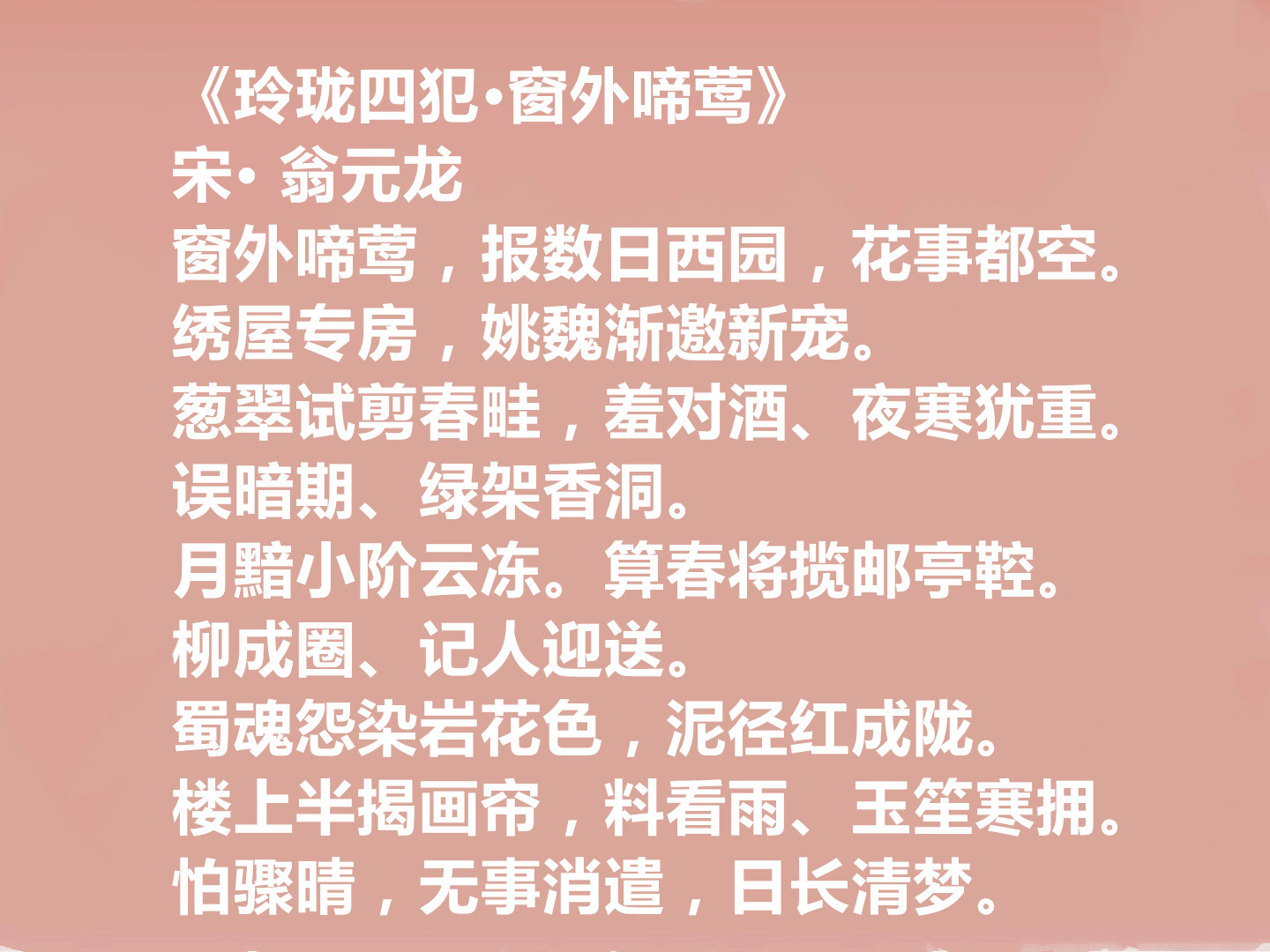 总之,翁元龙虽存词不多,却以独特的艺术风格,在南宋词坛留下了浓墨重彩的一笔,其词作的清雅之美,历经千年依然耐人寻味,下面欣赏他的十首词。