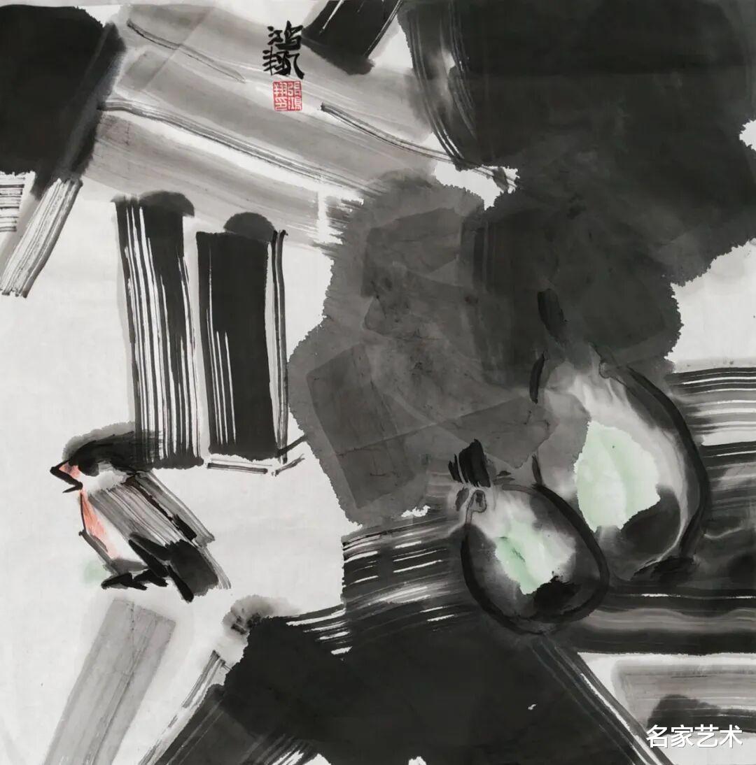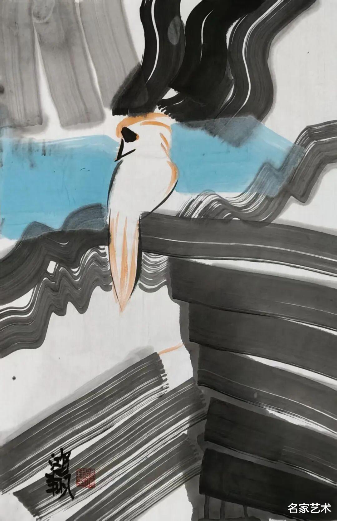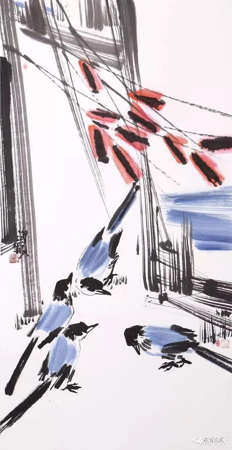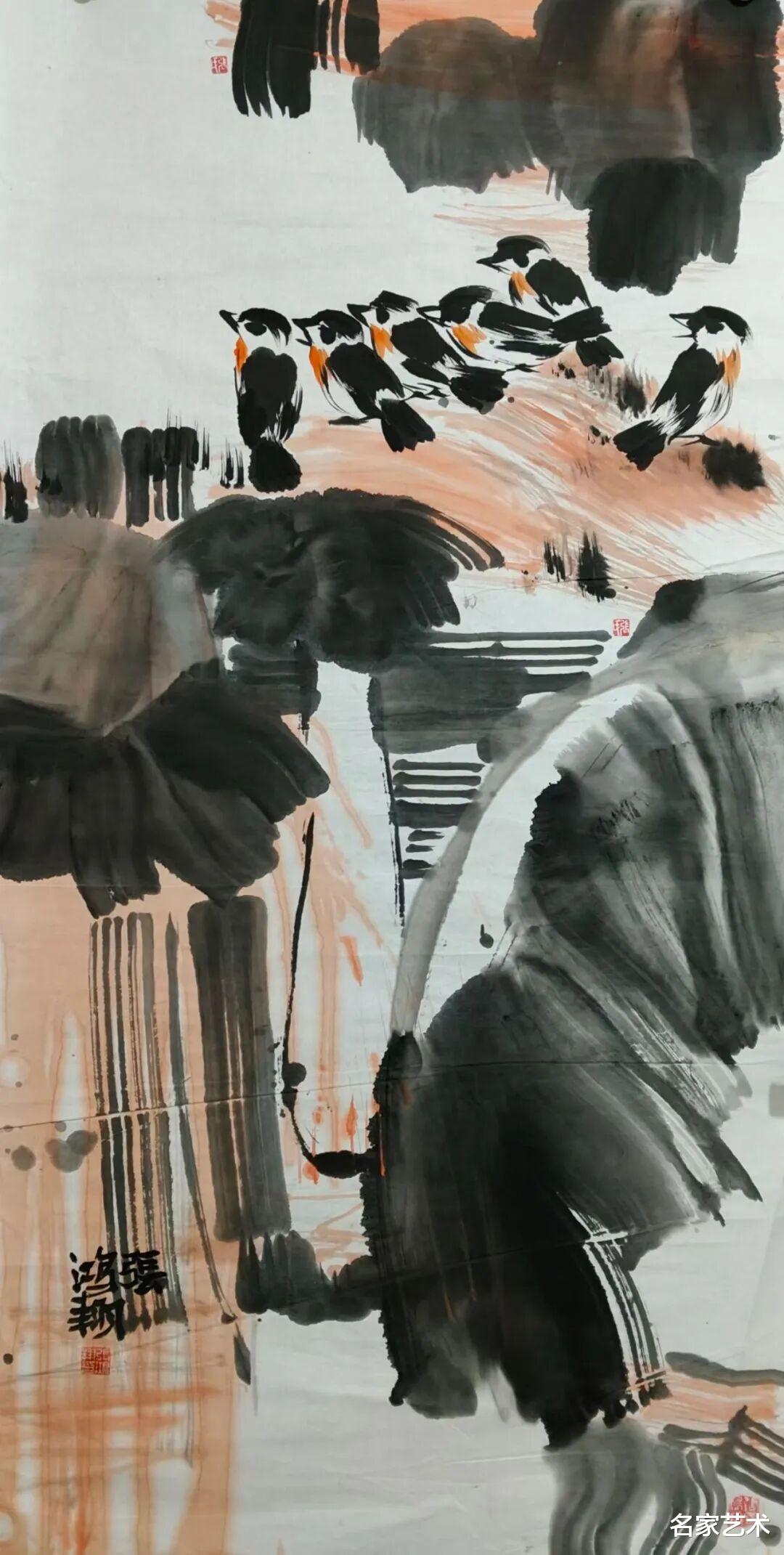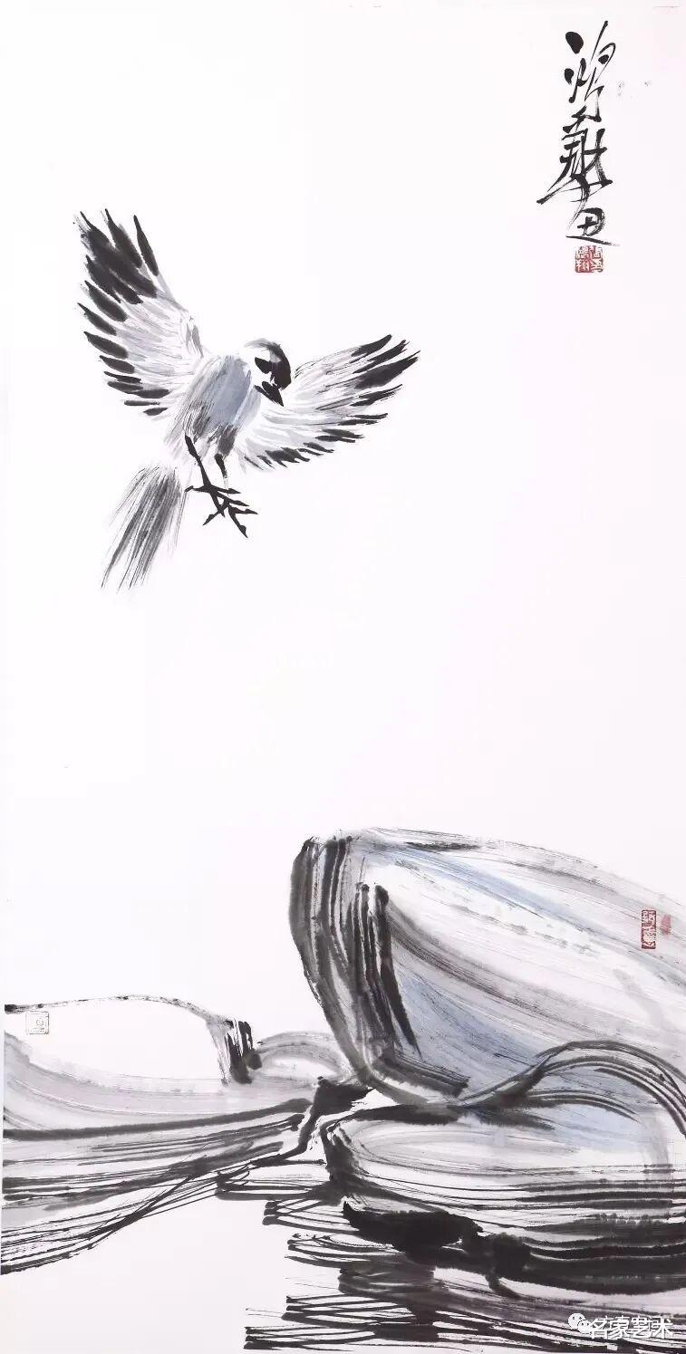 但张鸿翔另辟蹊径,大胆地将现代绘画的构成意识引入,在他的作品中,不再强调传统的笔墨,“鸟”只是作为他的一个绘画符号,通过黑白灰的大色块,将线和面穿插其中,很有力度,从而独具一格。他的作品,具有鲜明的时代气息和明朗强烈的风格,令我不由自主地想起林凤眠和吴冠中先生的画面。我想,这或许与张鸿翔先生的知识结构、思想觉悟和艺术积累分不开。之前,他画西画,而后主攻国画,与他目前从事的花鸟画教学紧密联系。