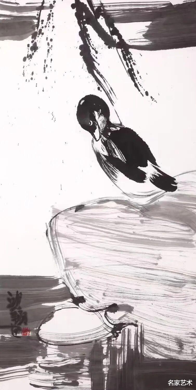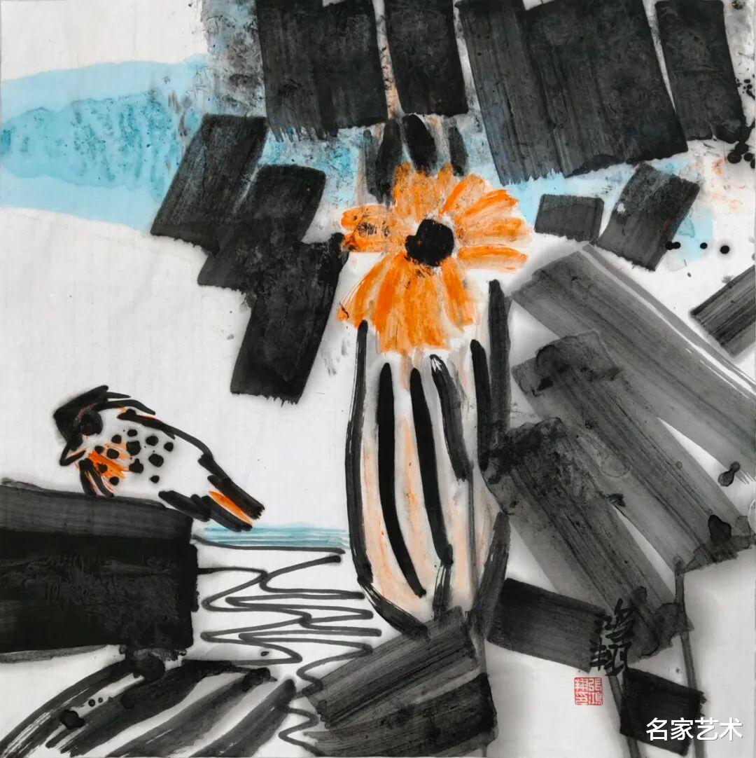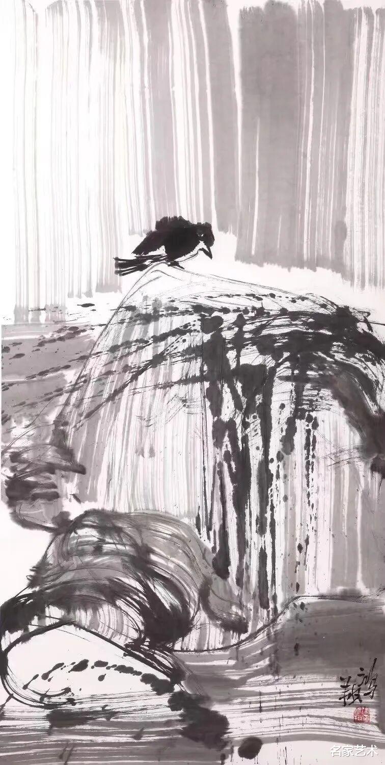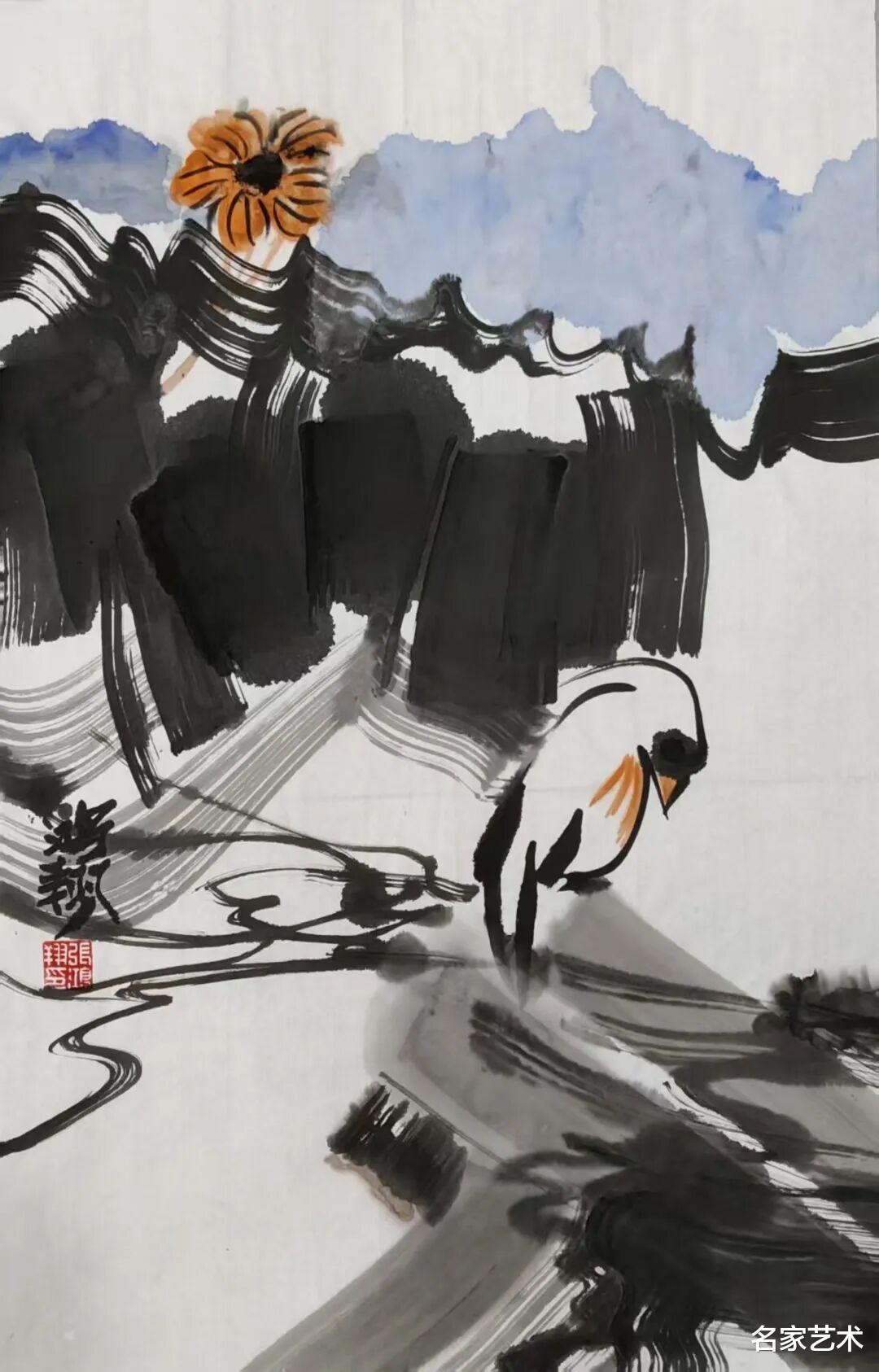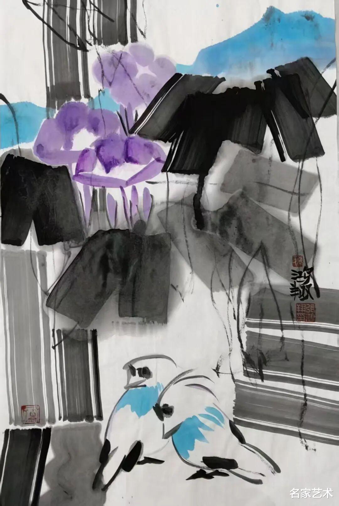 但张鸿翔另辟蹊径,大胆地将现代绘画的构成意识引入,在他的作品中,不再强调传统的笔墨,“鸟”只是作为他的一个绘画符号,通过黑白灰的大色块,将线和面穿插其中,很有力度,从而独具一格。他的作品,具有鲜明的时代气息和明朗强烈的风格,令我不由自主地想起林凤眠和吴冠中先生的画面。我想,这或许与张鸿翔先生的知识结构、思想觉悟和艺术积累分不开。之前,他画西画,而后主攻国画,与他目前从事的花鸟画教学紧密联系。