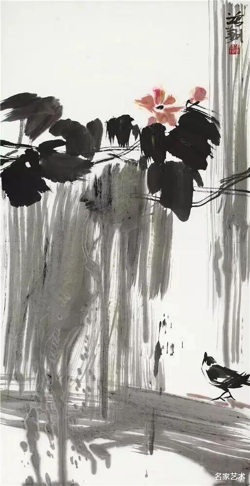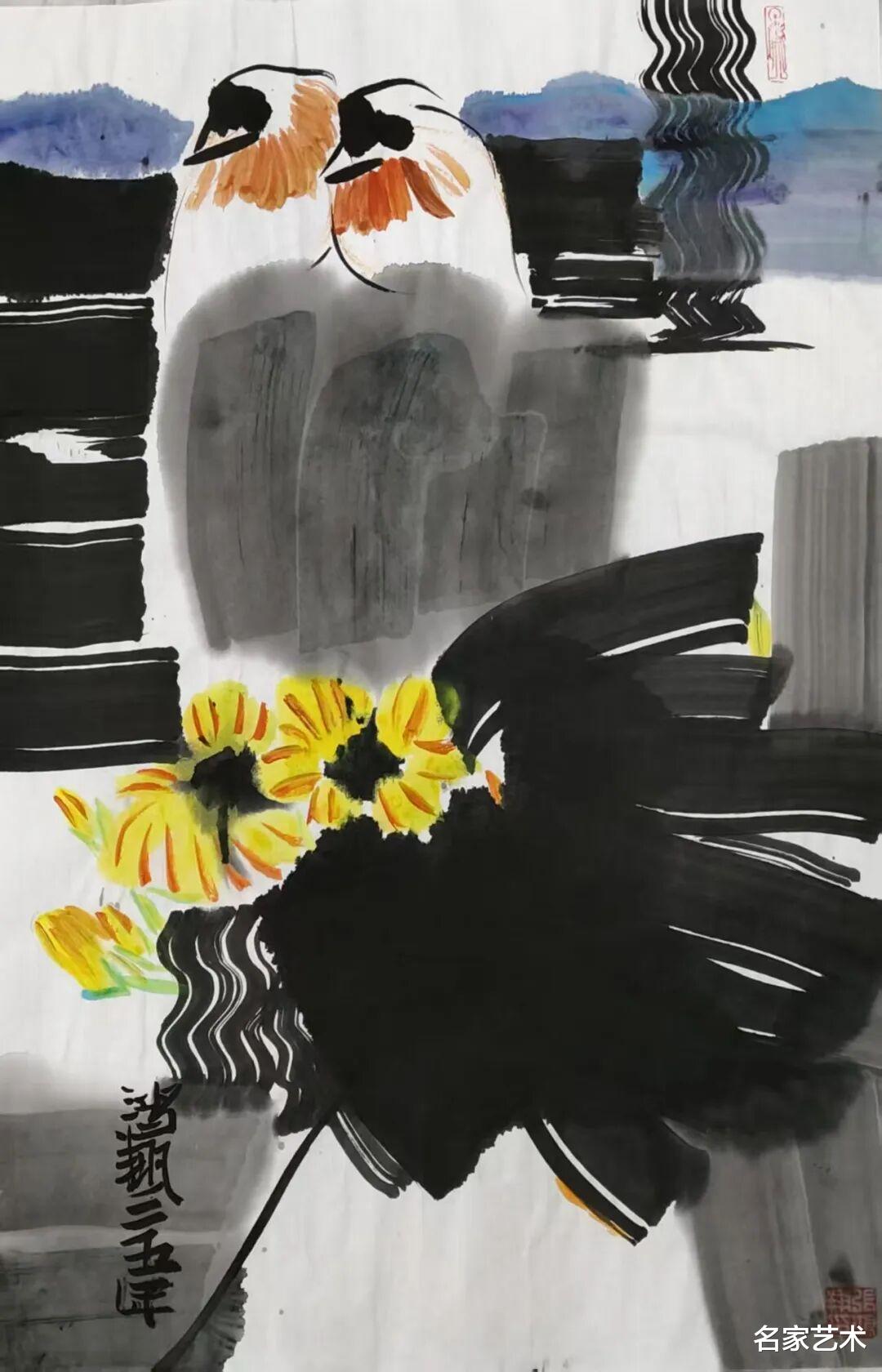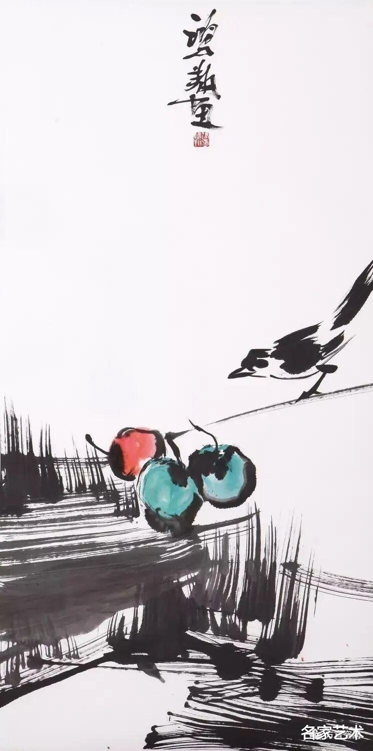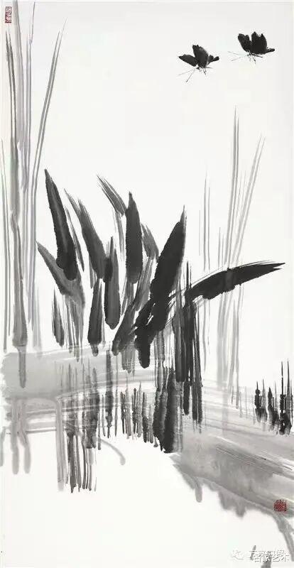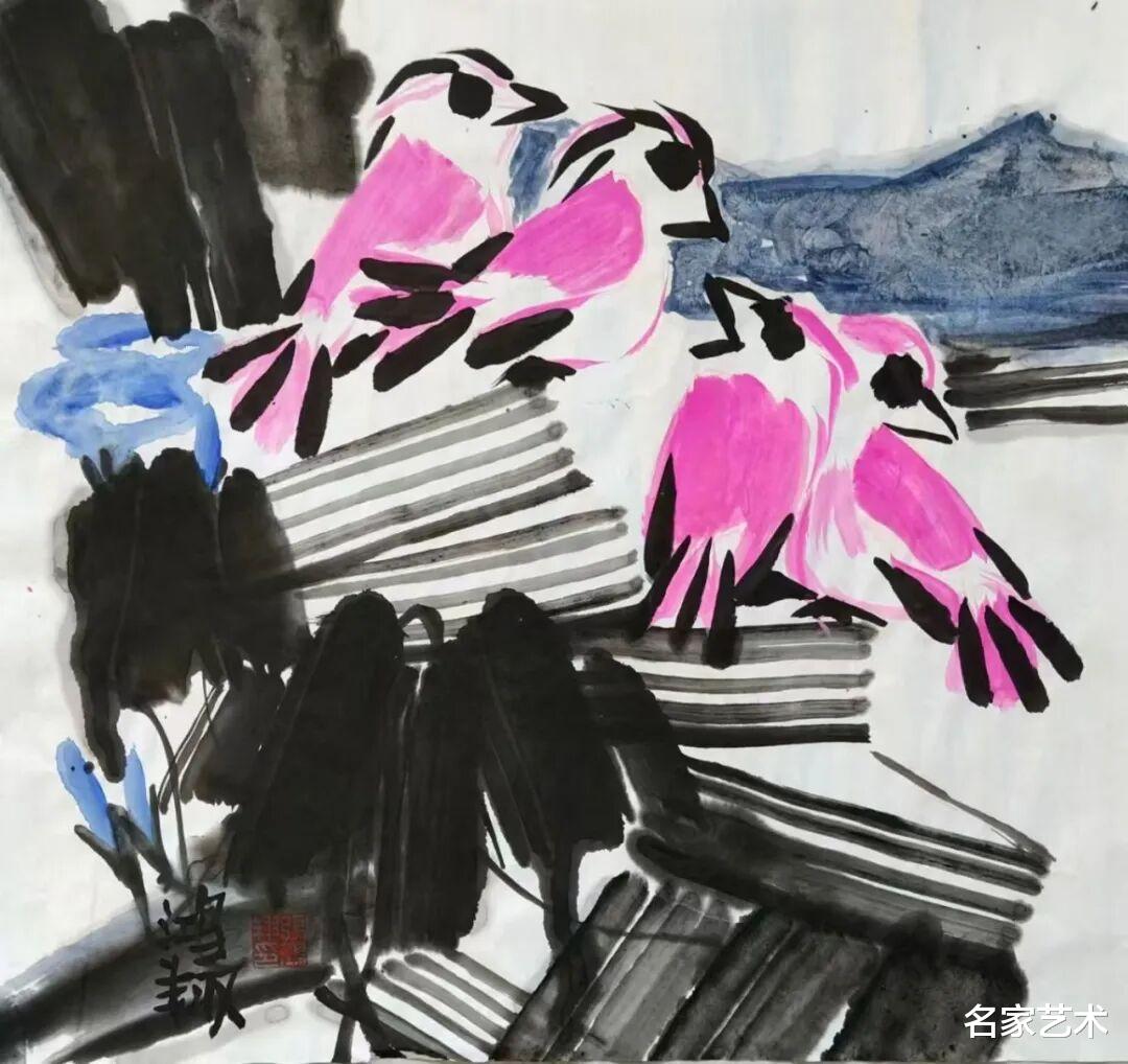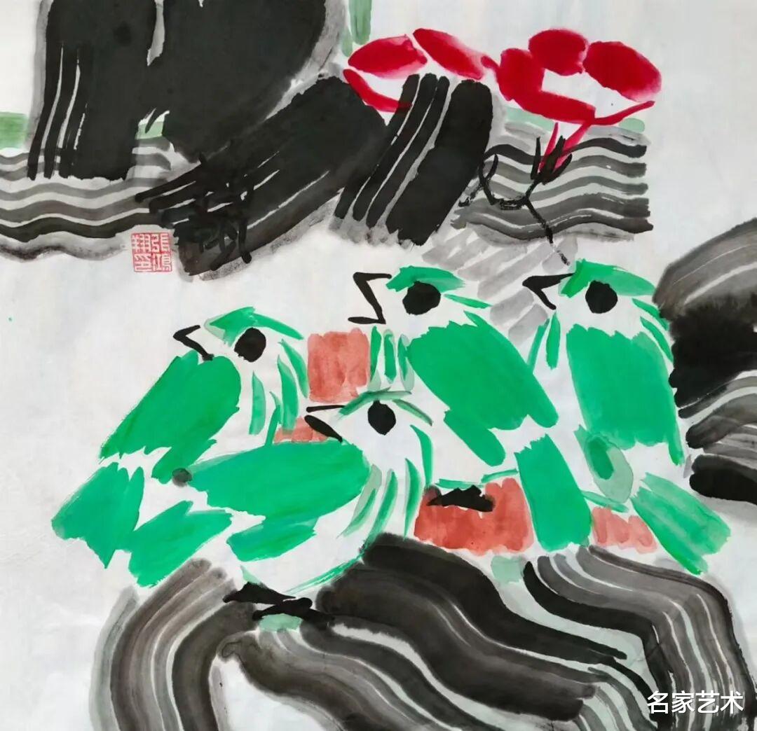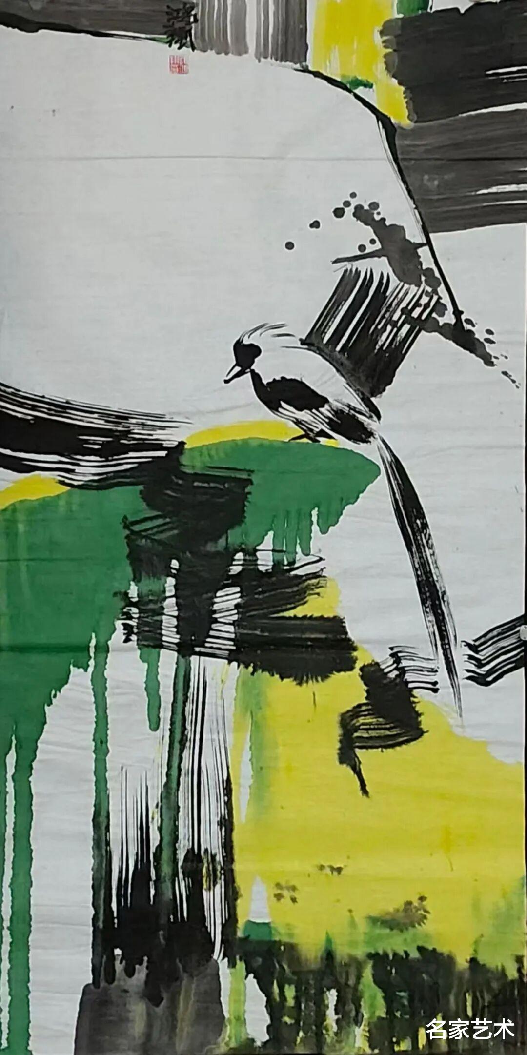 但张鸿翔另辟蹊径,大胆地将现代绘画的构成意识引入,在他的作品中,不再强调传统的笔墨,“鸟”只是作为他的一个绘画符号,通过黑白灰的大色块,将线和面穿插其中,很有力度,从而独具一格。他的作品,具有鲜明的时代气息和明朗强烈的风格,令我不由自主地想起林凤眠和吴冠中先生的画面。我想,这或许与张鸿翔先生的知识结构、思想觉悟和艺术积累分不开。之前,他画西画,而后主攻国画,与他目前从事的花鸟画教学紧密联系。