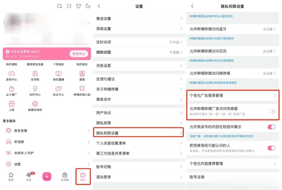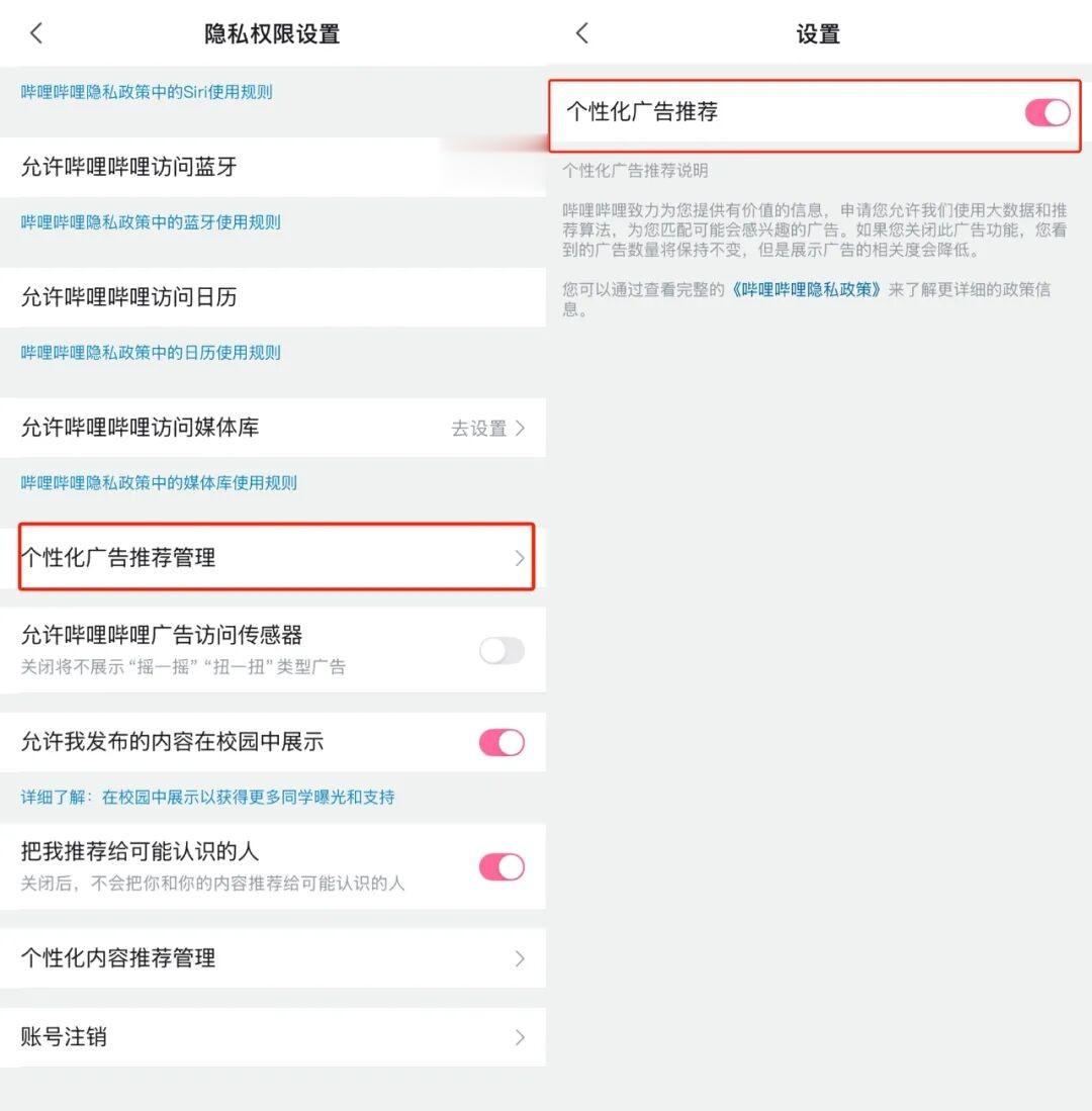 打开B站,进入【我的】-【设置】-【隐私权限设置】-【个性化广告推荐管理】,将“个性化广告推荐”右侧的按钮关闭;