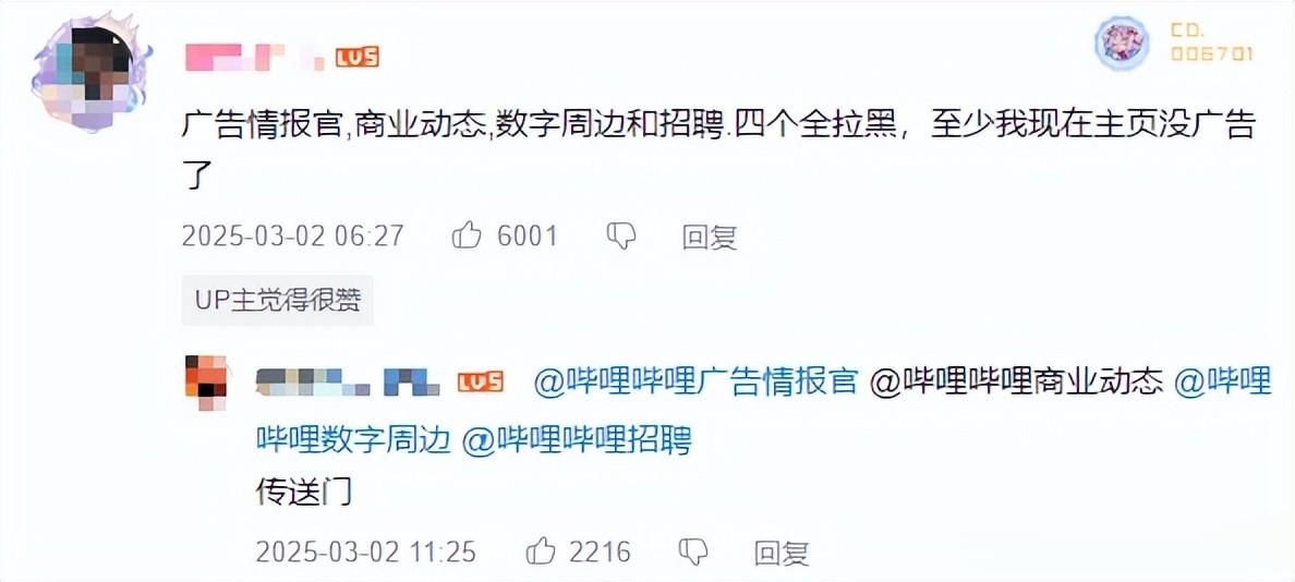 近几日,这个屏蔽广告的办法在网上流传,而B站也很快作出应对,网友发现在首页已无法搜到相关用户,不过在任意视频评论区@相关账号,再点进去就能拉黑了。