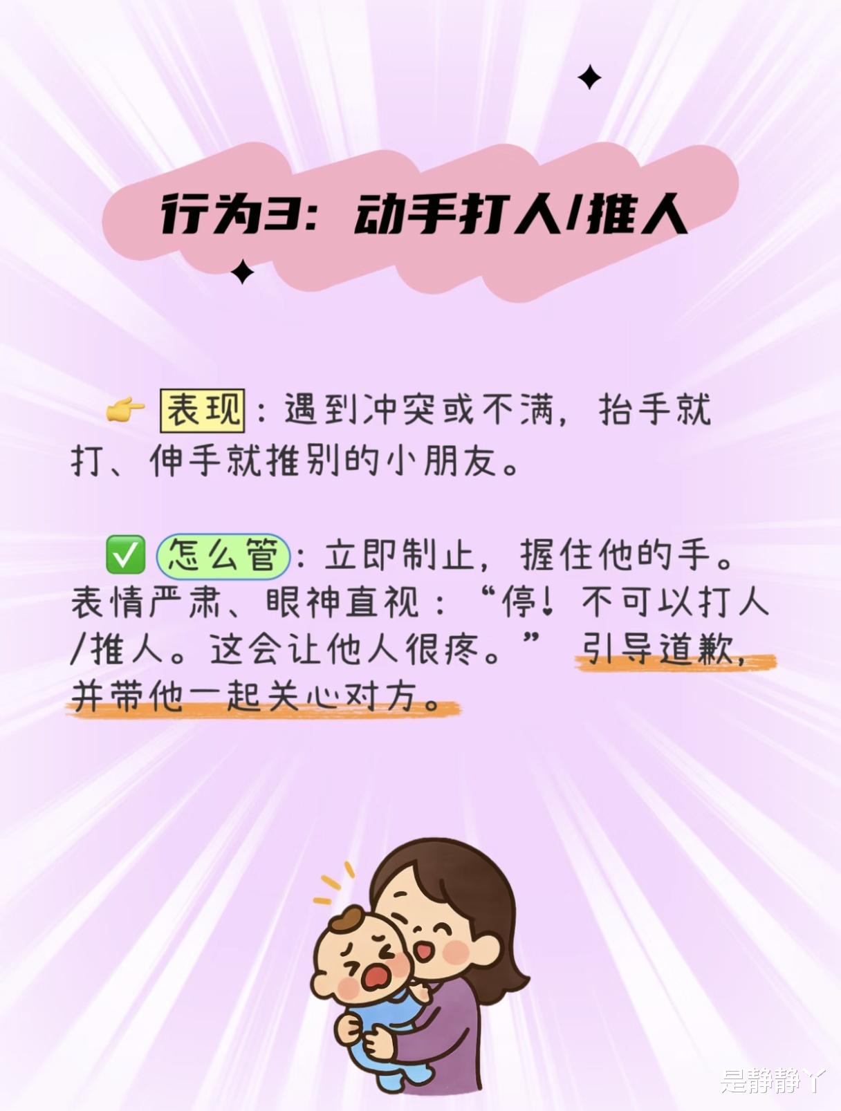 更严重的是孩子“动手打人/推人”的行为。虽然小孩子间因玩具或意见不合有小冲突正常,但若孩子一言不合就动手,问题就严重了。这不仅会伤害别的小朋友,也会让自己的孩子被孤立。遇到这种情况,家长必须立即制止,握住他的手,严肃告诉他:“停!不可以打人/推人。这会让他很疼。”然后引导孩子道歉,并关心对方。这不仅是教他遵守规则,更是培养同理心,让他明白自己的行为会给别人带来什么感受。如果家长对孩子打人视而不见,甚至觉得“孩子小,不懂事”,孩子会误以为暴力是解决问题的唯一途径,长大后可能用同样方式对待他人,到时候后悔莫及。