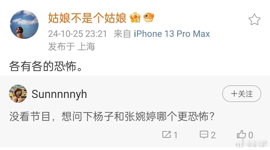 有网友问杨子和张婉婷哪个更恐怖,被张婉婷本人看到并回复了六个字:各有各的恐怖