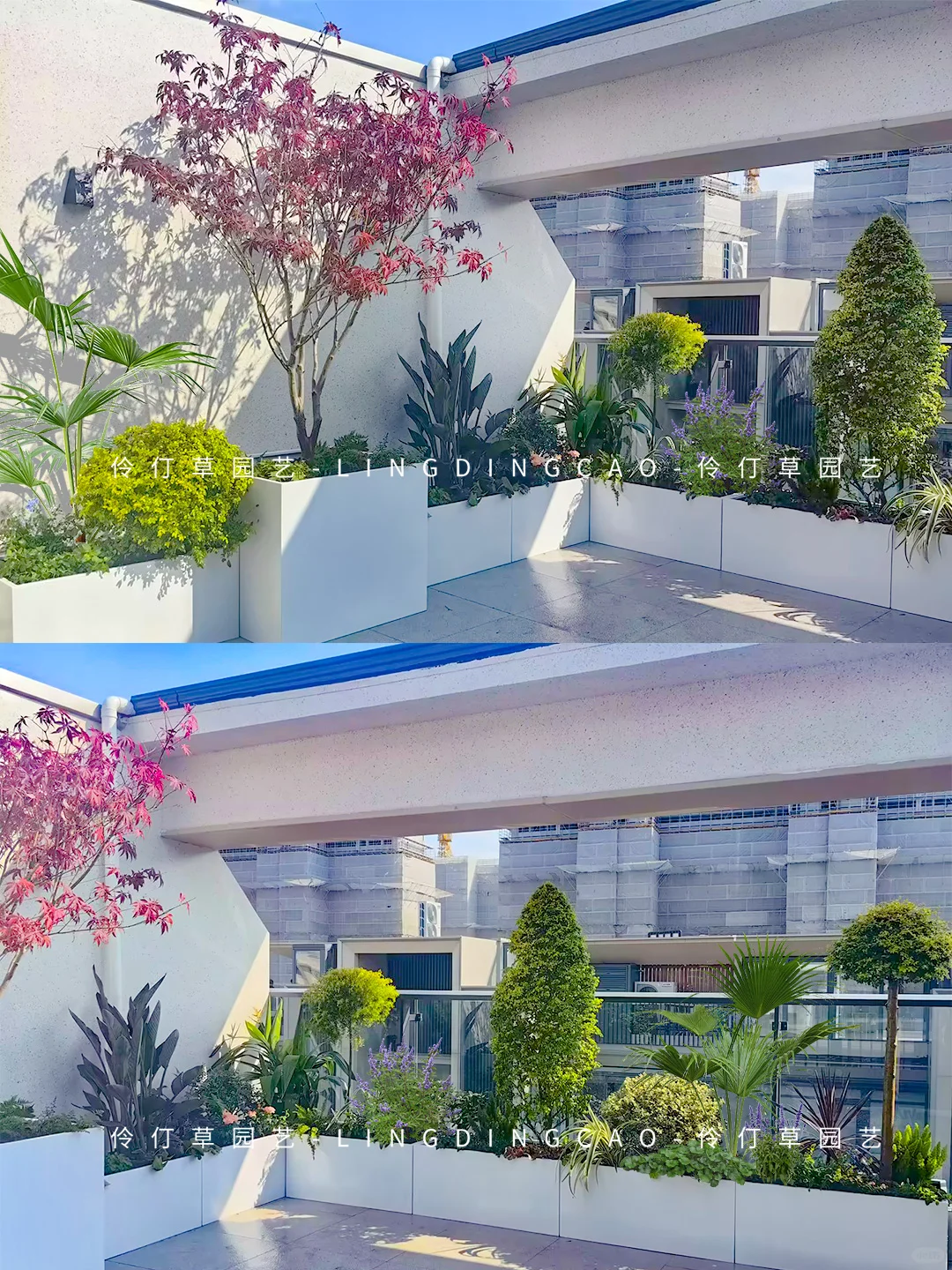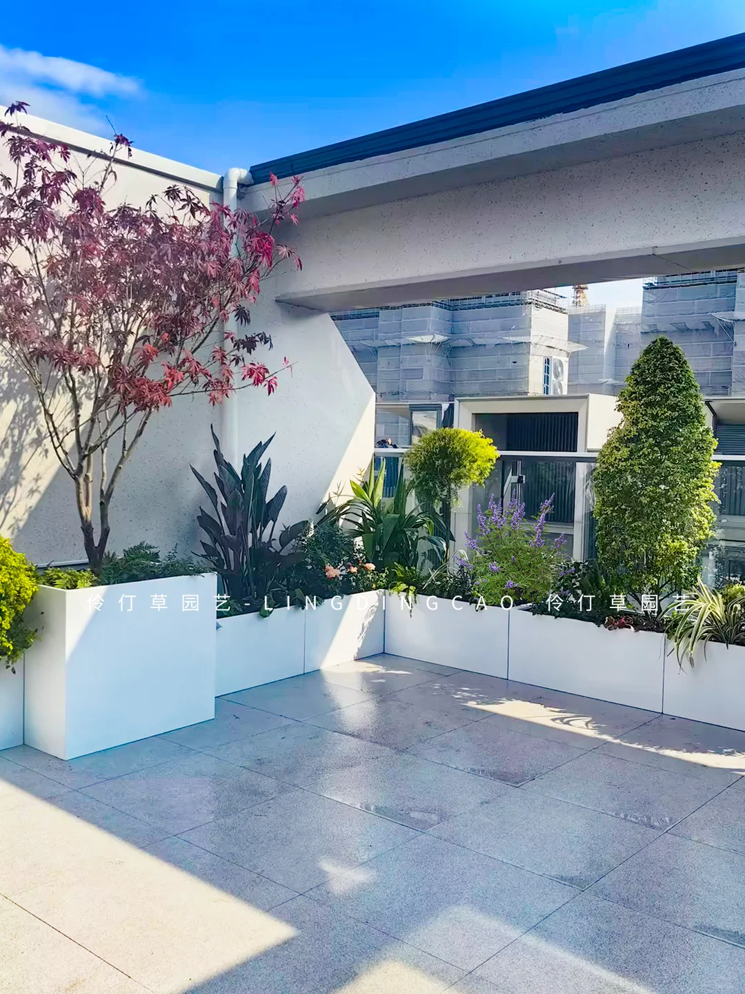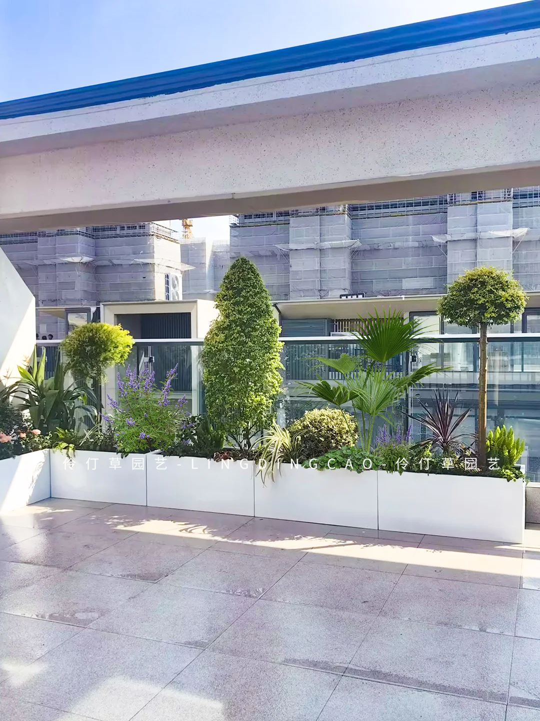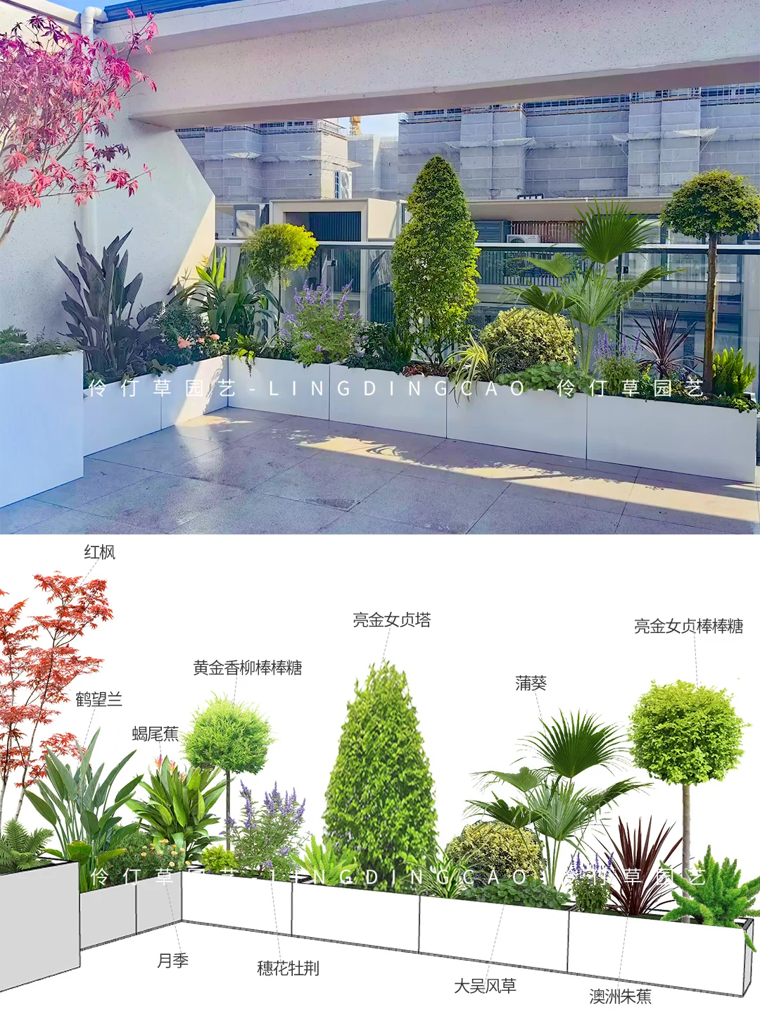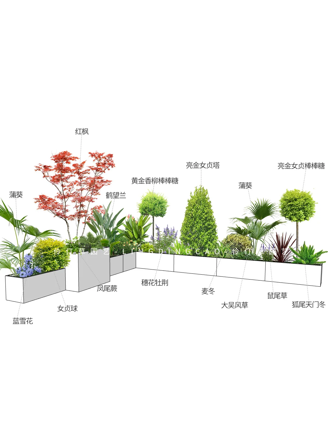 植物配置:蒲葵、蓝雪花、女贞球、凤尾蕨、穗花牡荆、麦冬、大吴风草、鼠尾草、狐尾天门冬、亮金女贞棒棒糖、亮金女贞塔、黄金香柳棒棒糖、鹤望兰、红枫