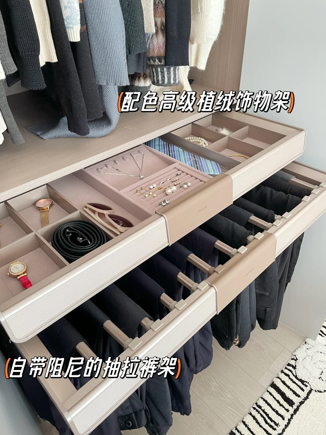 📦饰物架,隔板下装上一个抽拉式饰物架,真的YYDS,面料是绒面的,很有质感。收纳规划井井有条。