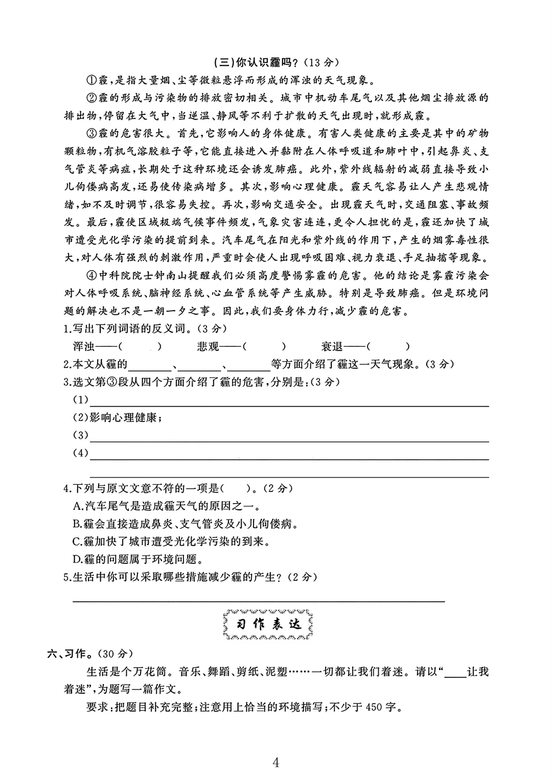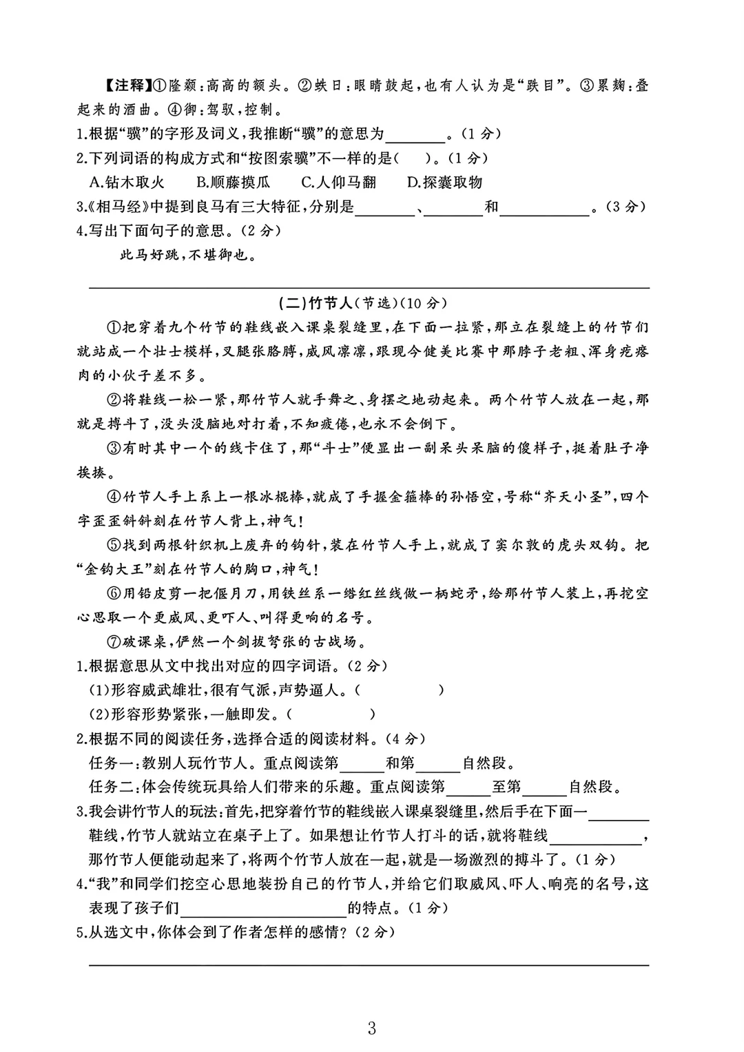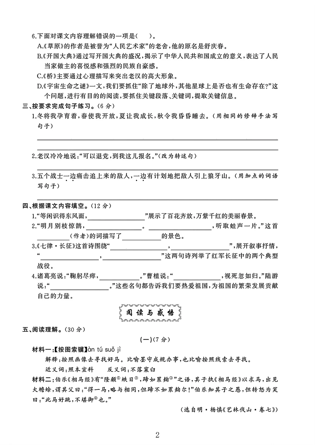 人教版 六年级上册语文 期中试卷 期中考试 电子版可打印 试卷