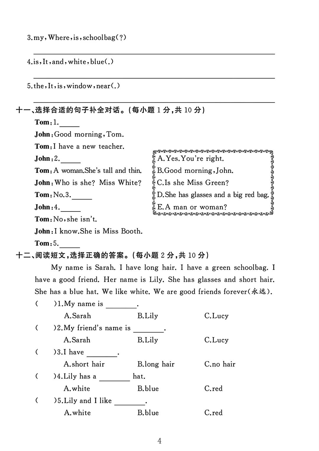 人教版 四年级上册英语 期中试卷 期中考试 电子版可打印 试卷