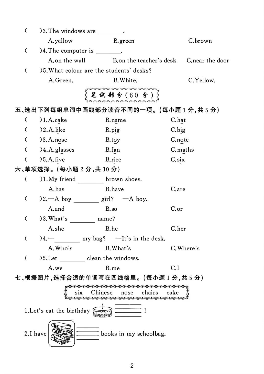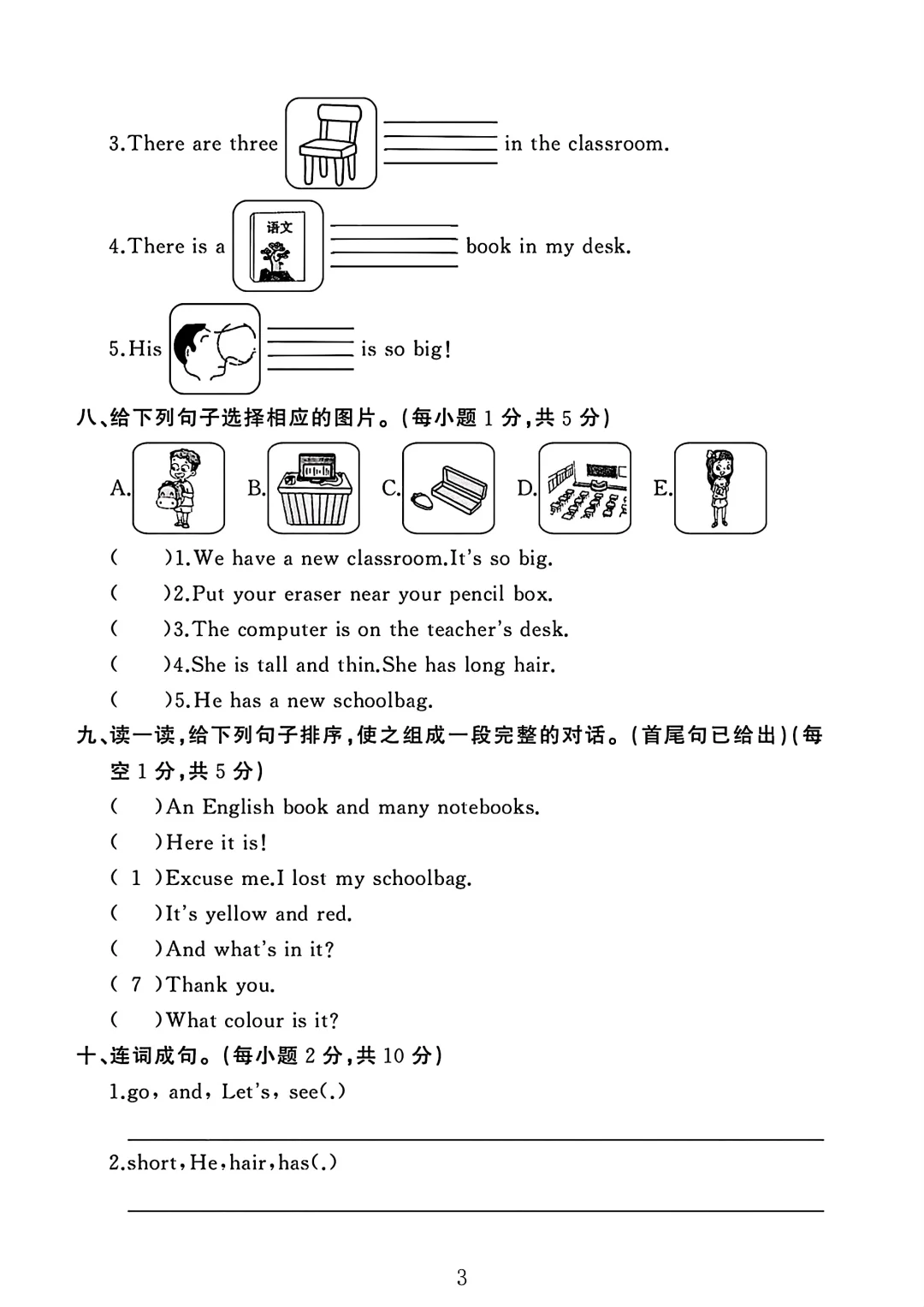 人教版四年级英语上册期中测试卷 3