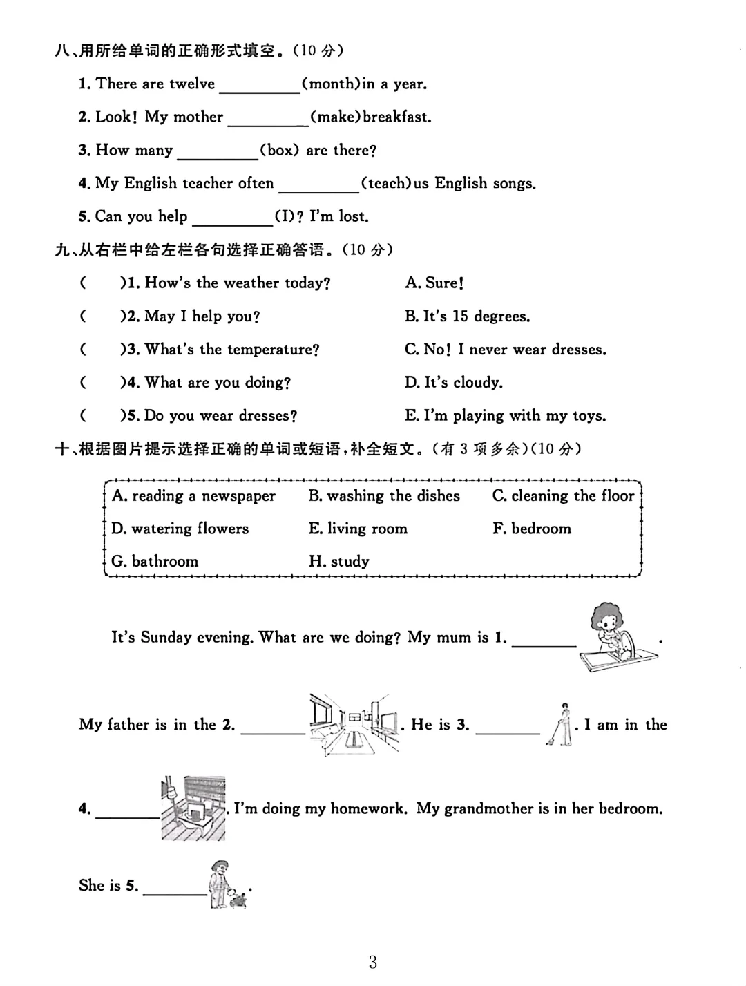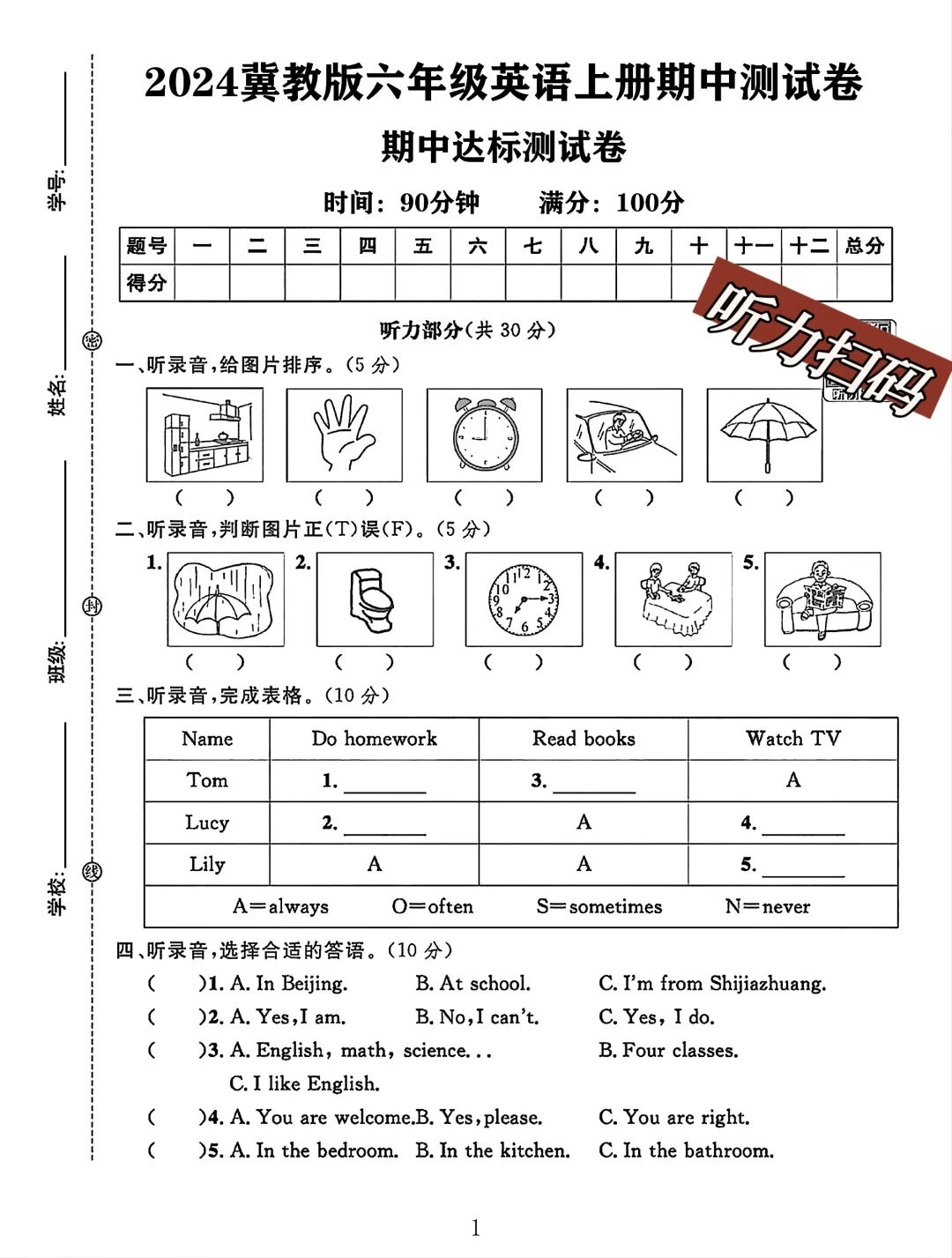 冀教版小学英语 六年级上册英语 期中考试 期中试卷 电子版可打印 试卷