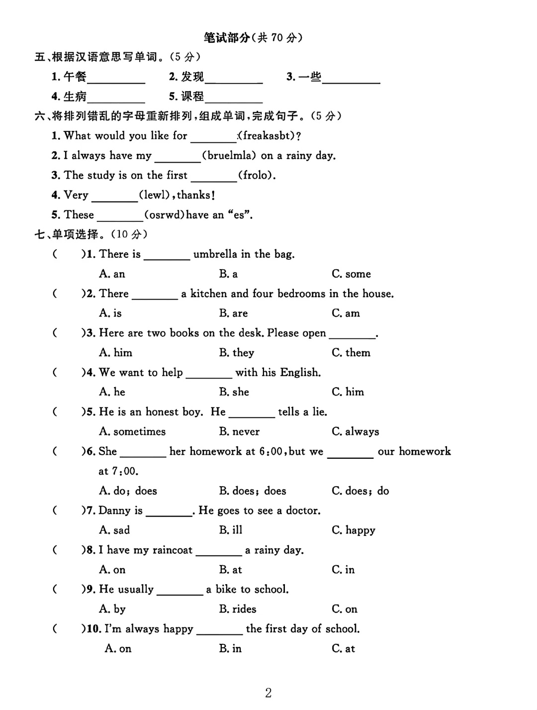 冀教版六年级英语上册期中测试卷 2(B卷
