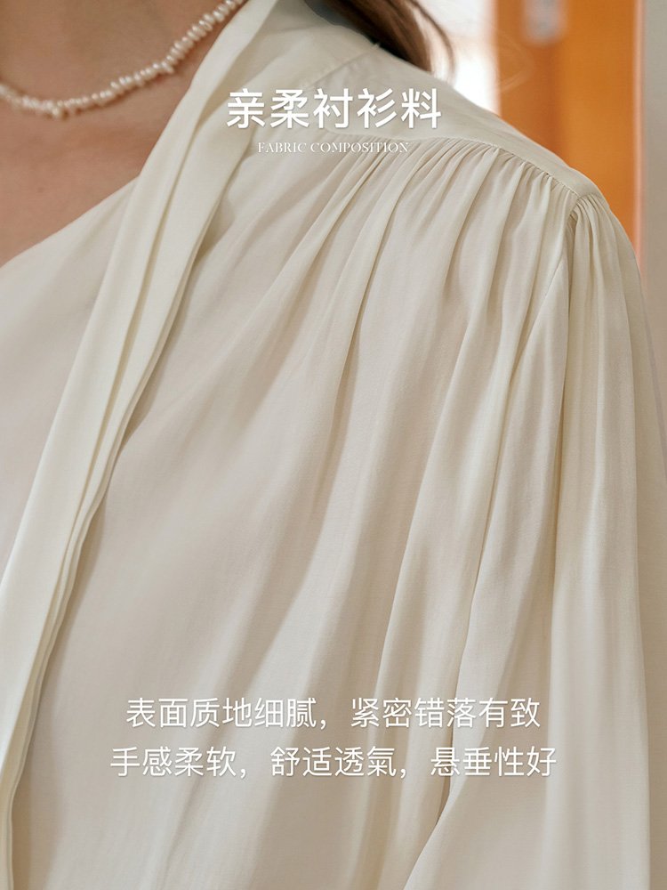 亲柔衬衫料,手感爽滑细腻,亲肤透氣;轻盈飘逸,轻松营造出自在闲适的穿着体验;V领飘带设计,灵动优雅,修饰颈部线条;可自然垂落,也可随心绑系各种造型;肩前及后背碎褶,让整件衣服更宽松舒适;丰富立体层次的同时,不会软塌沾身