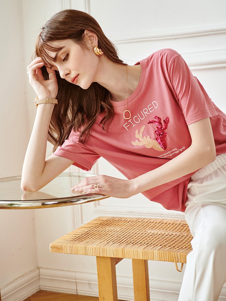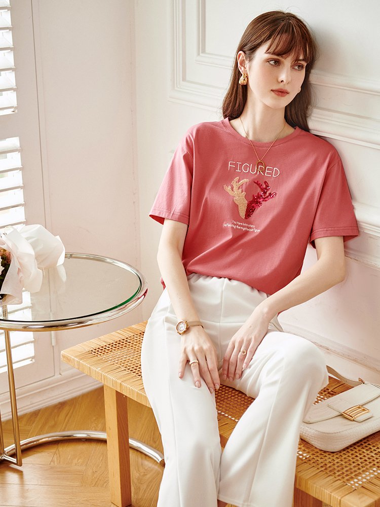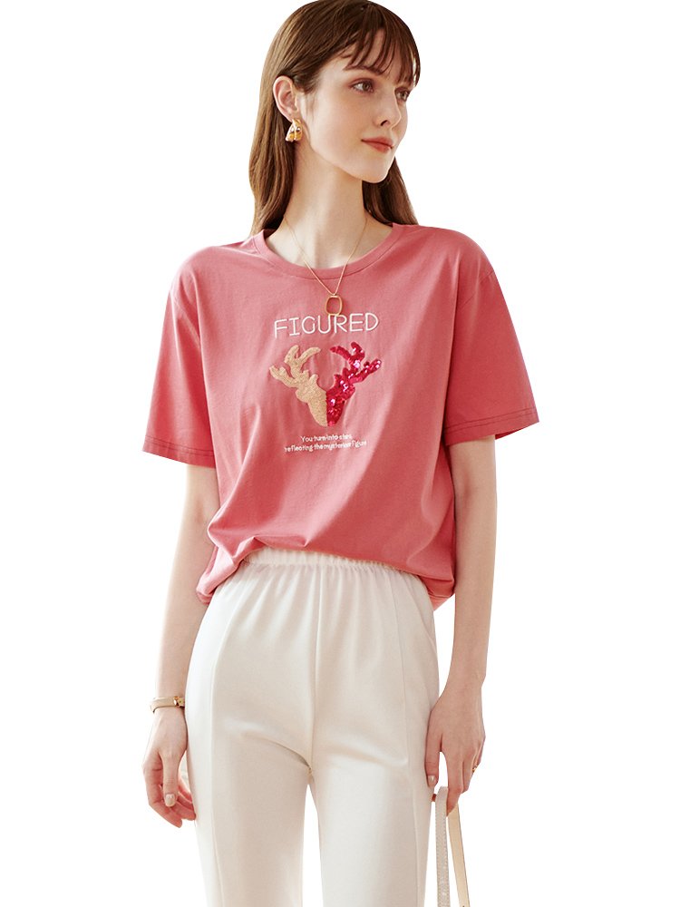 经典圆领设计,轻松修饰脸型,穿脱方便,保证了舒适度和年轻感,宽松落肩袖,敲舒适巨藏肉!不仅显干净清爽,还能强化休闲感!胸前双色珠片绣鹿头图案+精至字母刺绣,趣味满满,画面感敲级丰富!