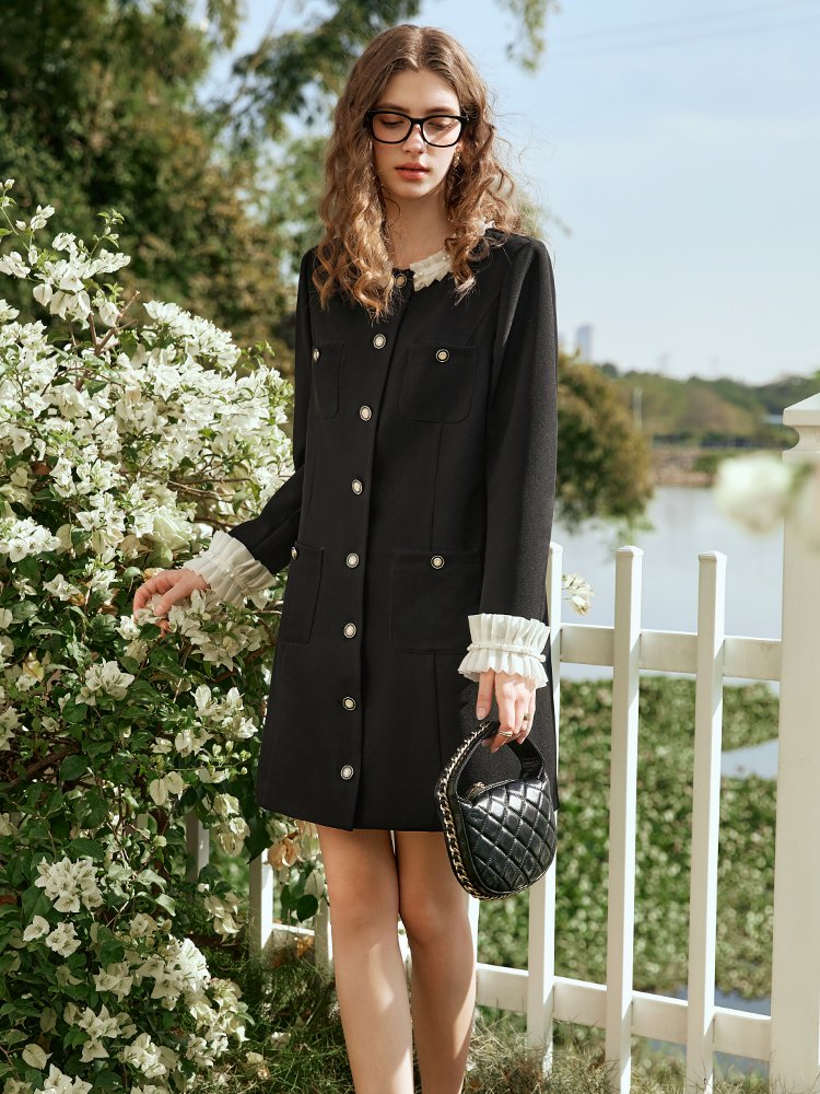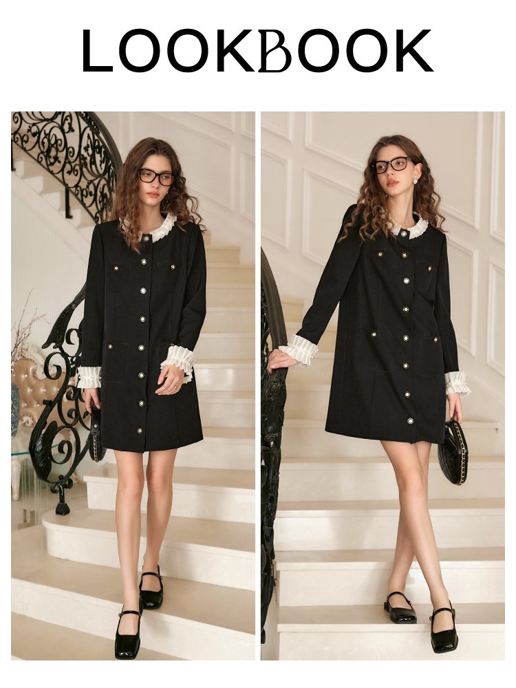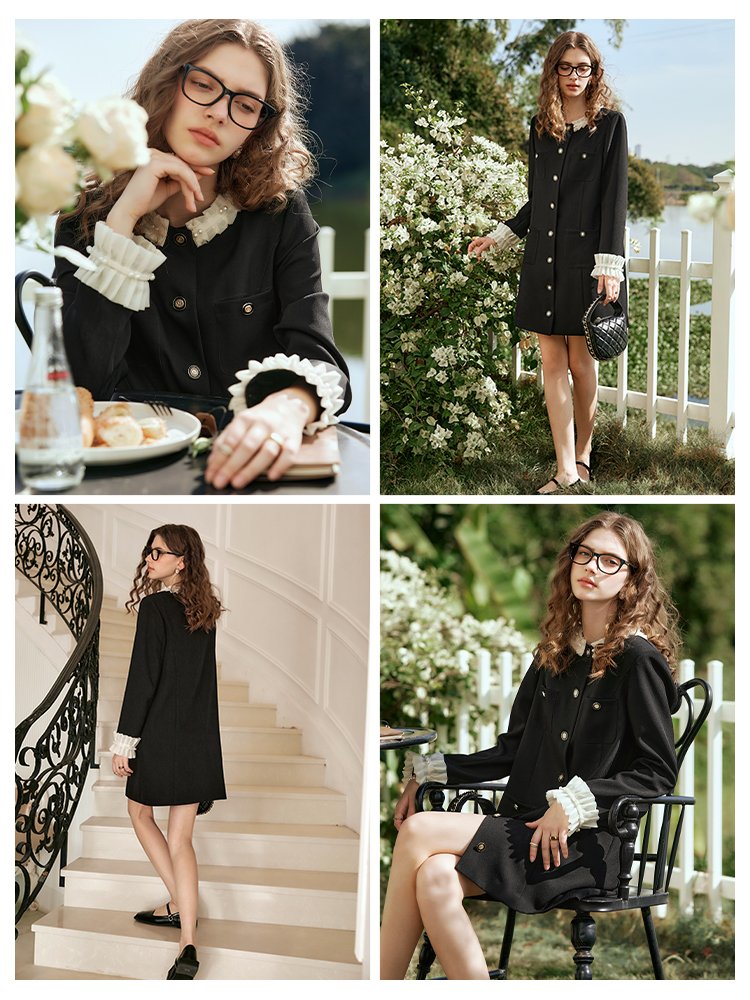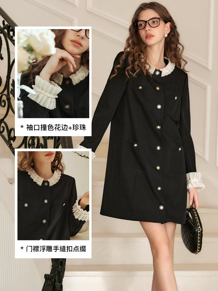 领边、袖口拼接重工雪纺定制花边,甜美浪漫;搭配精至环葆珍珠点缀,凸显立体层次感;门襟高密度手工钉扣,耗时耗力,重工吸睛好穿脱;对称四口袋,一粒扣点缀,美观实用,立体有型
