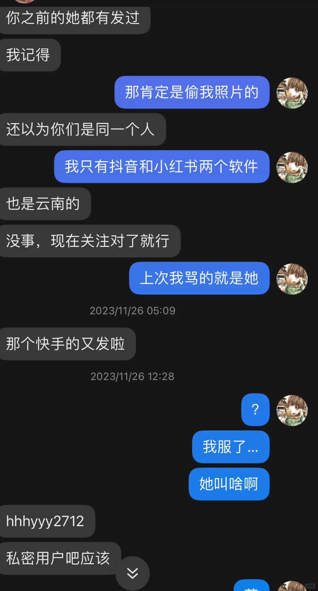 还有另一位在西安偷我两年多照片的朋友,此人现在已经销声匿迹无处寻了,之前用我照片在语音陪聊陪玩平台上赚钱牟利,被骂后装聋作哑疑似土遁。后几张是现在还在偷我照片的账号 和。