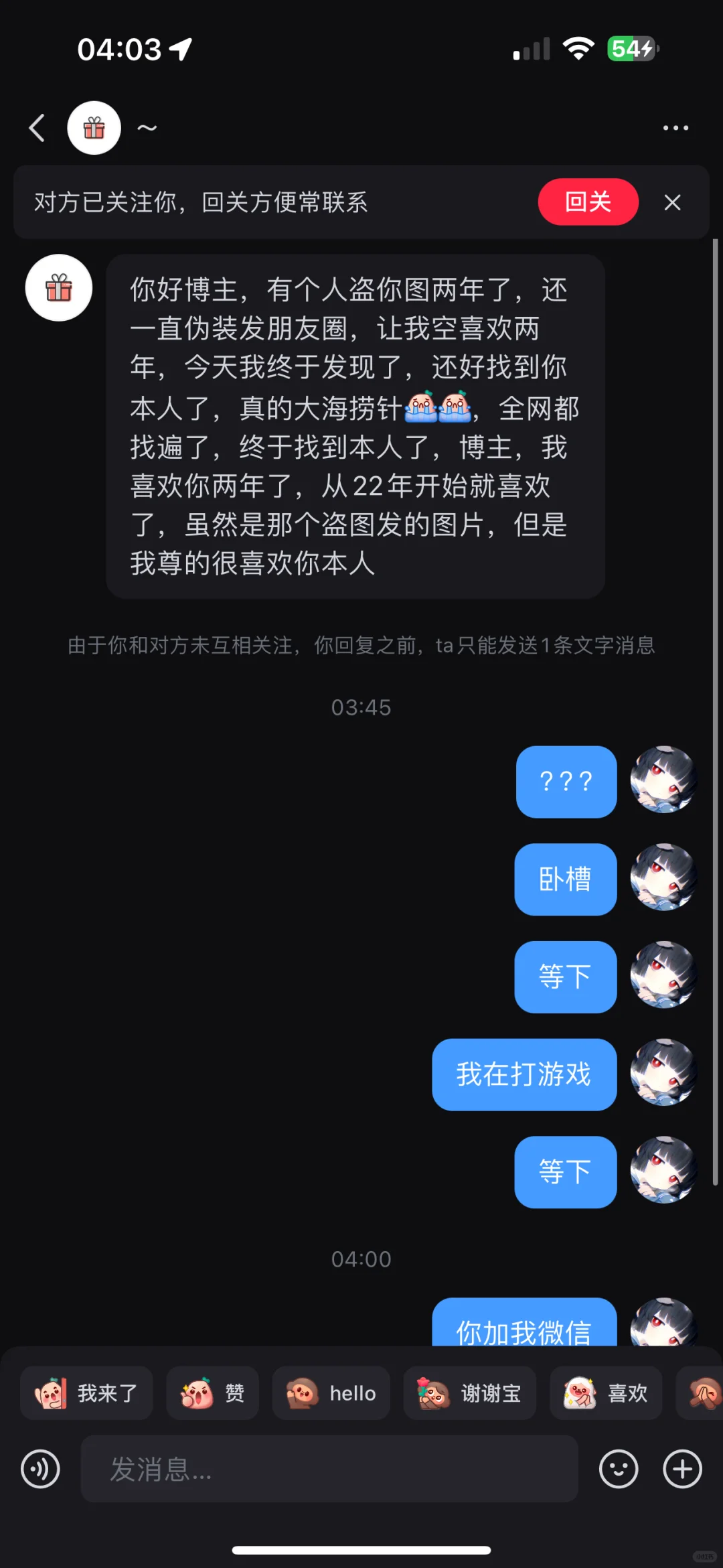 并且她一直到现在都还在锲而不舍的偷我照片假装本人哈。大家注意不要上当受骗了真正的csy是个人机是不会主动热情钓鱼聊天的哈。
