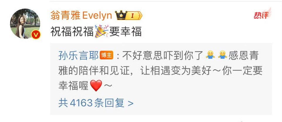 #翁青雅体面人# 翁青雅评论祝福孙乐言了,孙乐言的回复被指是复制黏贴,因为一般复