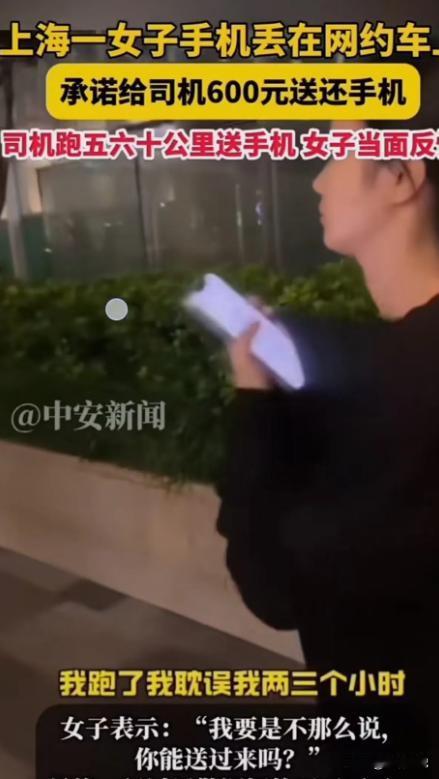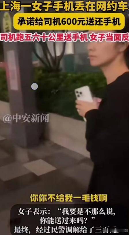 上海,女子手机丢在网约车上,承诺给司机600元送还手机。可司机耽误3个小时给女子送回手机后,女子却当面反悔一分不给!司机:“你怎么能骗人呢?”女子:“我不这样说,你会把手机送回吗?这是我的手机,你向我要钱就是敲诈!” (来源:中安新闻) 10月26日上海这个繁华都市的某个角落,一起由丢手机引发的事件揭开了人与人之间信任的裂痕,引发了一场关于诚信与道德的网络风暴。 王女士没想到一次平常的网约车经历,竟让她成了舆论的焦点。那天她急着去赴一个重要的约会,匆忙中将手机遗落在了车上。 她发现手机不见了急得团团转。那部高端手机里不仅存储着重要的工作资料和私人信息,更承载着她生活的点点滴滴。 王女士费了好一番周折终于联系上了司机。电话那头司机确认手机还在车上。王女士悬着的心终于放了下来当即表示愿意支付500元酬金,希望司机能尽快将手机送回。 然而事情并没有那么顺利。司机告知王女士他目前距离她所在的位置有50多公里,正值上海交通高峰期,送还手机至少需要两三个小时,还要放弃其他订单损失不小。 他提出将酬金提高到600元。王女士当时只想尽快拿回手机便毫不犹豫地答应了。司机听到王女士的承诺也决定中断手头的订单,驱车前往王女士所在的位置。 上海的交通状况比想象中还要糟糕。司机在拥堵的车流中艰难前行,看着手机应用上不断跳出的新订单提醒内心也开始焦躁起来。 但他还是信守承诺坚持向目的地驶去。两个多小时后司机终于将手机送到了王女士手中。就在他善意提醒王女士支付之前约定的酬金时王女士的态度却发生了180度大转变。 她说手机本来就属于她司机要钱是在敲诈。司机被这突如其来的变故惊呆了。他辛辛苦苦跑了50多公里放弃了其他订单的收入,到头来却换来这样的结果。 他感觉自己被耍了一股怒火涌上心头。双方争执不下最终选择报警处理。民警到场后对双方进行了调解。 从法律角度来说,司机确实没有义务将遗失物品送还只需要妥善保管即可。但王女士之前的口头承诺也具有一定的法律效力。 最终在民警的调解下,王女士勉强支付了300元作为补偿。司机虽然心里不太服气,但想想时间和精力的损耗也只能勉强接受。 这事儿在网上迅速传播网友们讨论得热火朝天。有人指责王女士言而无信,缺乏诚信;有人同情司机的遭遇,认为他付出了时间和精力理应得到相应的报酬; 也有人质疑网约车平台的监管机制,认为平台应该制定更完善的规则,保障司机和乘客的权益。 这起事件不仅是经济上的争端还反映出人们之间信任的缺失。在一个信息高度流通的时代每个人的行为都可能被放大和传播。 王女士的失信行为不仅损害了自身的形象,也给社会带来了负面影响。这件事也让大家开始思考道德的界限。 这起手机丢失的事表面看很简单,但其实背后涉及不少复杂的社会问题。这话不只是钱的事还牵扯到诚信、道德和法律的问题。 它告诉我们追求个人利益时别忘了坚守道德,维护社会秩序和良好风尚。在这个变化莫测的时代诚实守信变得更加重要。 它是人们之间沟通的纽带也是社会稳步发展的基础。 咱们每个人都应该从自己做起诚实守信,为大家创造一个更和谐、更美好的社会出一份力。