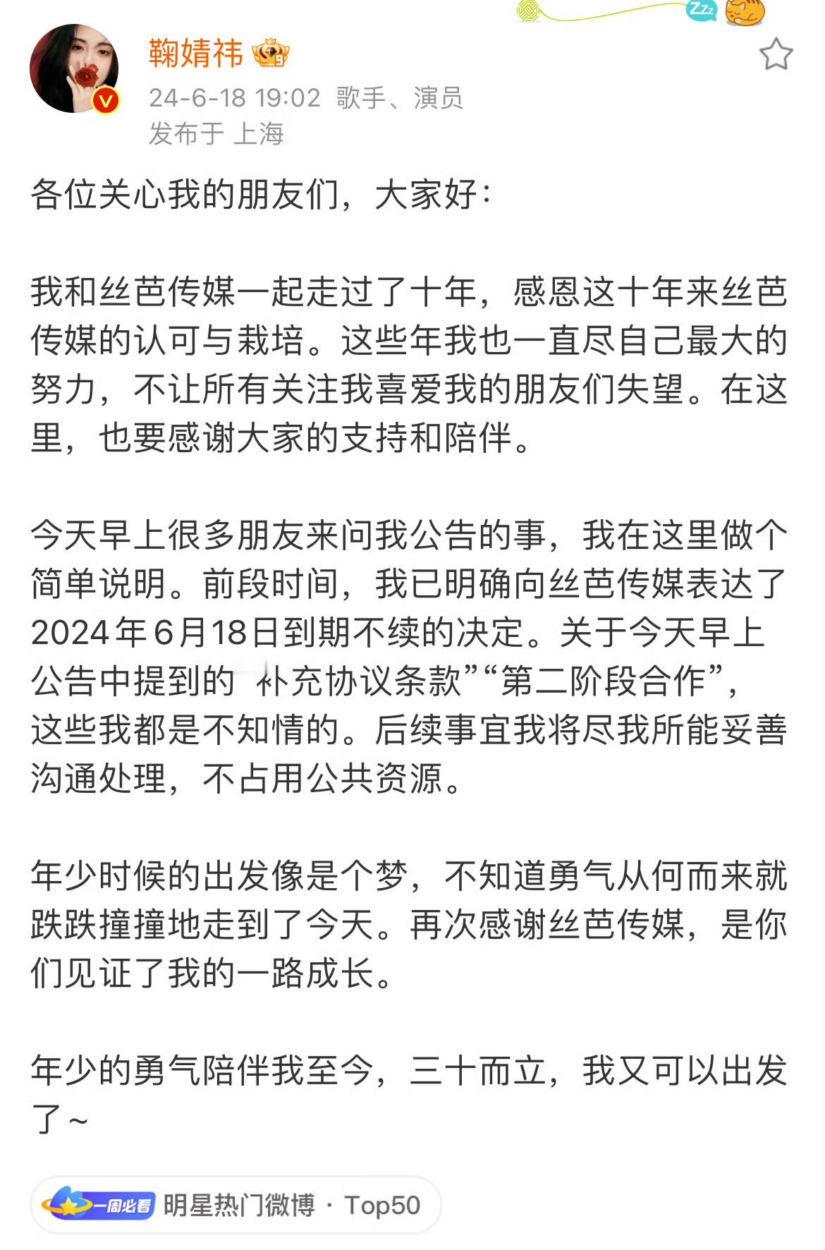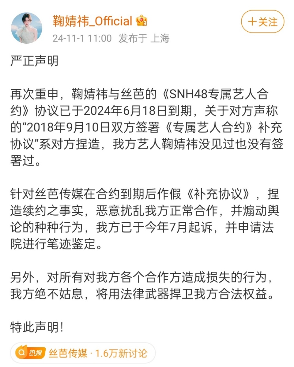 #鞠婧祎7月起诉丝芭传媒# 鞠婧祎方回应被丝芭传媒起诉,再次否认签署过专属艺人补充协议,已经于7月起诉丝芭传媒了,并申请笔迹鉴定。到期不续,相信她陪着她!#鞠婧祎申请笔迹鉴定##丝芭传媒起诉鞠婧祎#