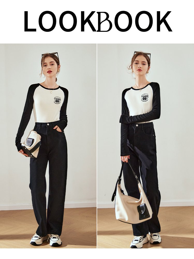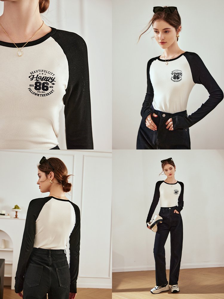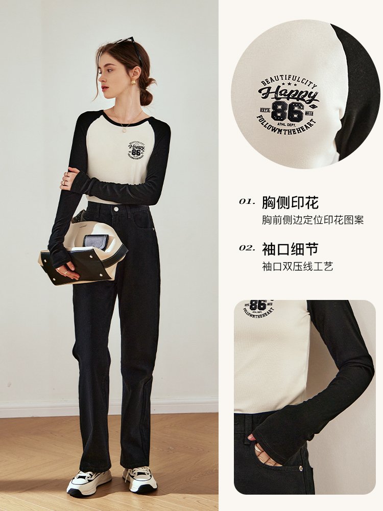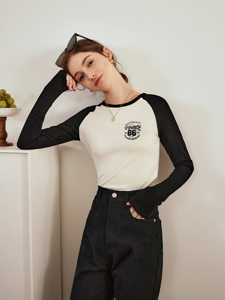 时髦感拉满!时尚黑白撞色插肩印花T恤