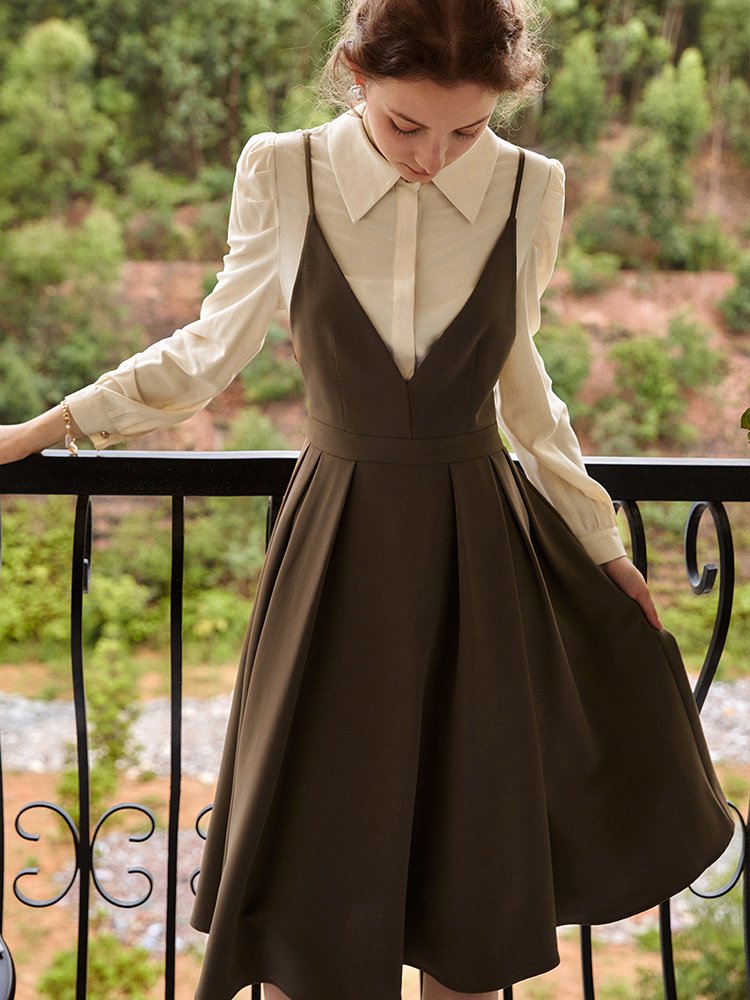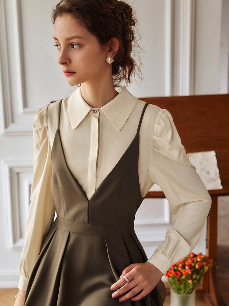 领型设计 经典衬衫领设计,精至有格调,上身利落显精气神;袖型设计 泡泡袖设计,袖顶收褶立体有型,轻松优化头肩比;饰扣点缀 精至一粒饰扣点缀领口,优雅耐看,篙质吸睛;后背隐拉 后背隐形拉链设计,美观大方,顺滑好拉,穿脱方便;肩带设计 显瘦细肩带设计,贴合肩部线条,衬得身形纤瘦轻盈;领型设计 深V领设计,气质优雅迷人,不费力修饰脖颈线条;收腰设计 收腰版型裁剪,轻松划分身材比例,穿出小蛮腰;蝴蝶结绑带 后背蝴蝶结绑带,丰富裙身造型感,甜美减龄;裙摆细节 裙摆卷边压线,走线细密紧实,做工很精细