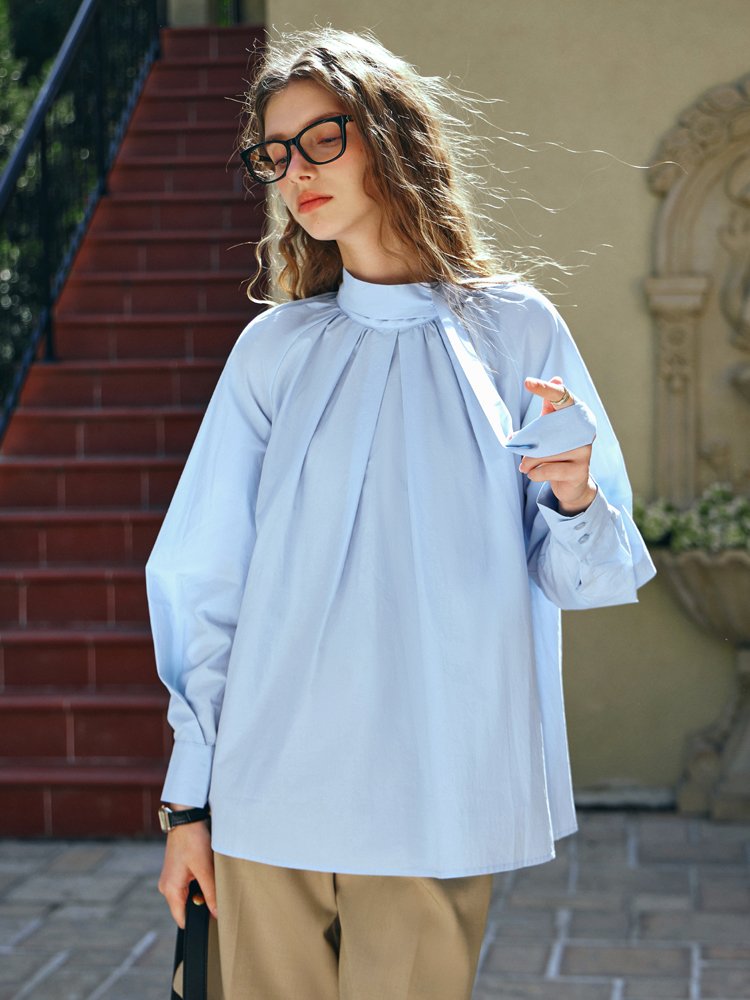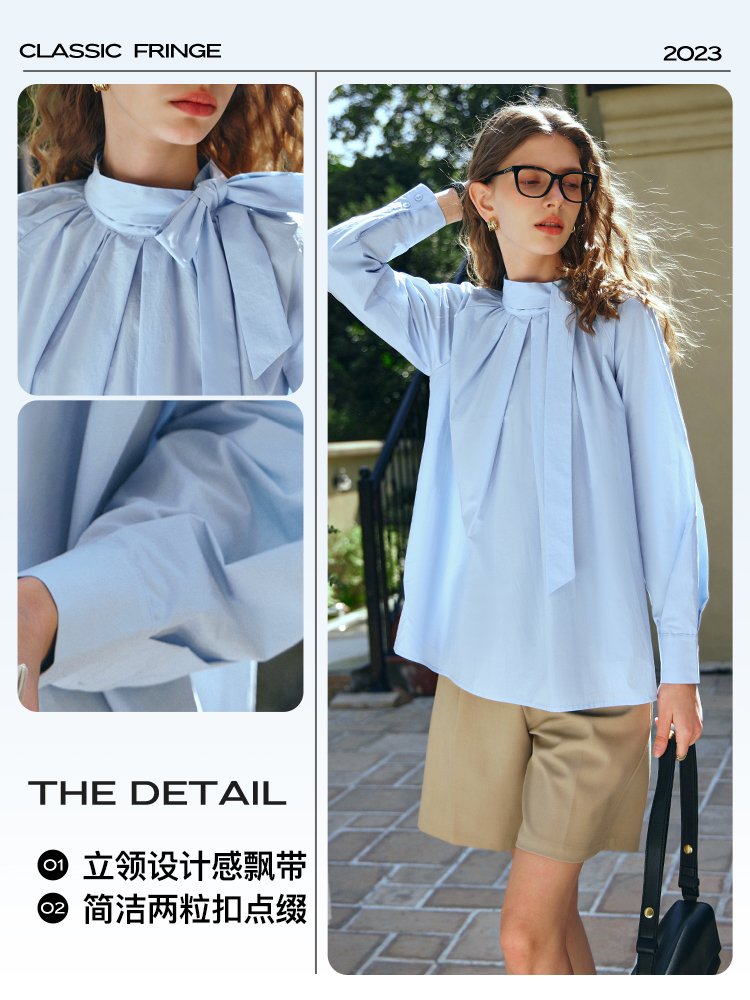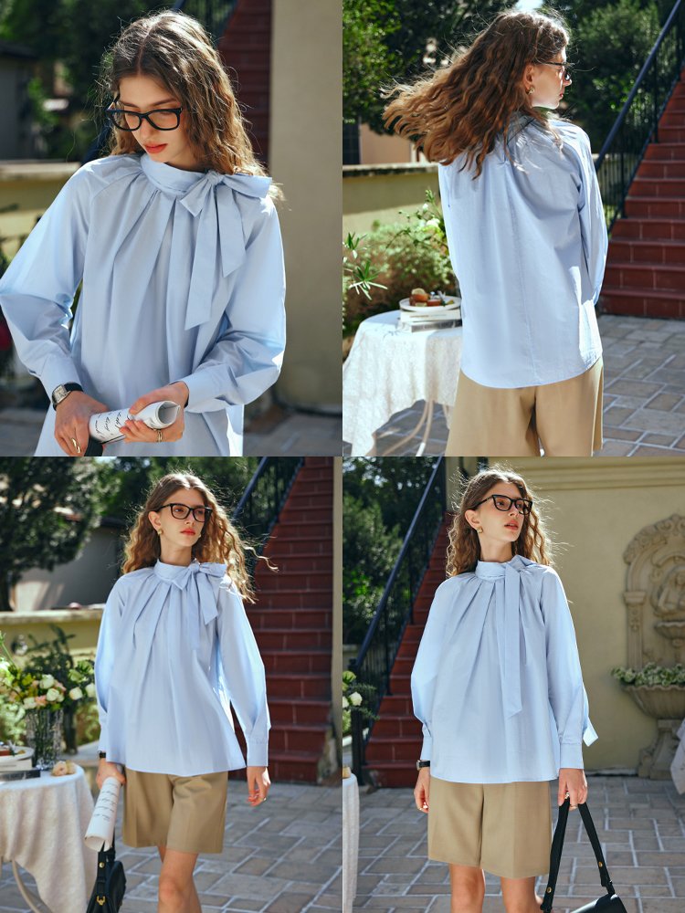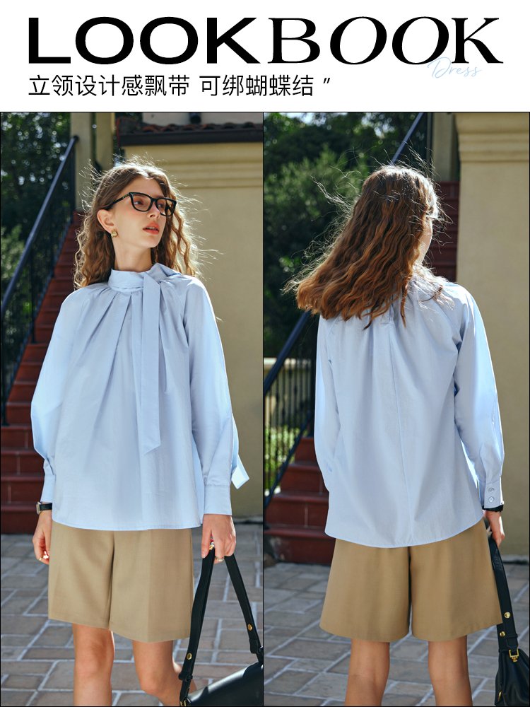 时装衬衫梭织料,亲肤不扎,抗’皱易打理;立领设计感飘带,侧边两粒手缝扣固定‘’可绑蝴蝶结,气质优雅精至,视觉修长天鹅颈;领口压褶有余量,包容性好,随性慵懒松弛;后领口两粒扣做水滴型开叉,穿脱方便;宽松插肩袖,包容性强,上身显瘦遮手臂