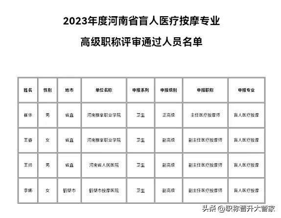 2023年度河南省盲人医疗按摩专业高级职称评审通过人员名单已公示! #河南职称#
